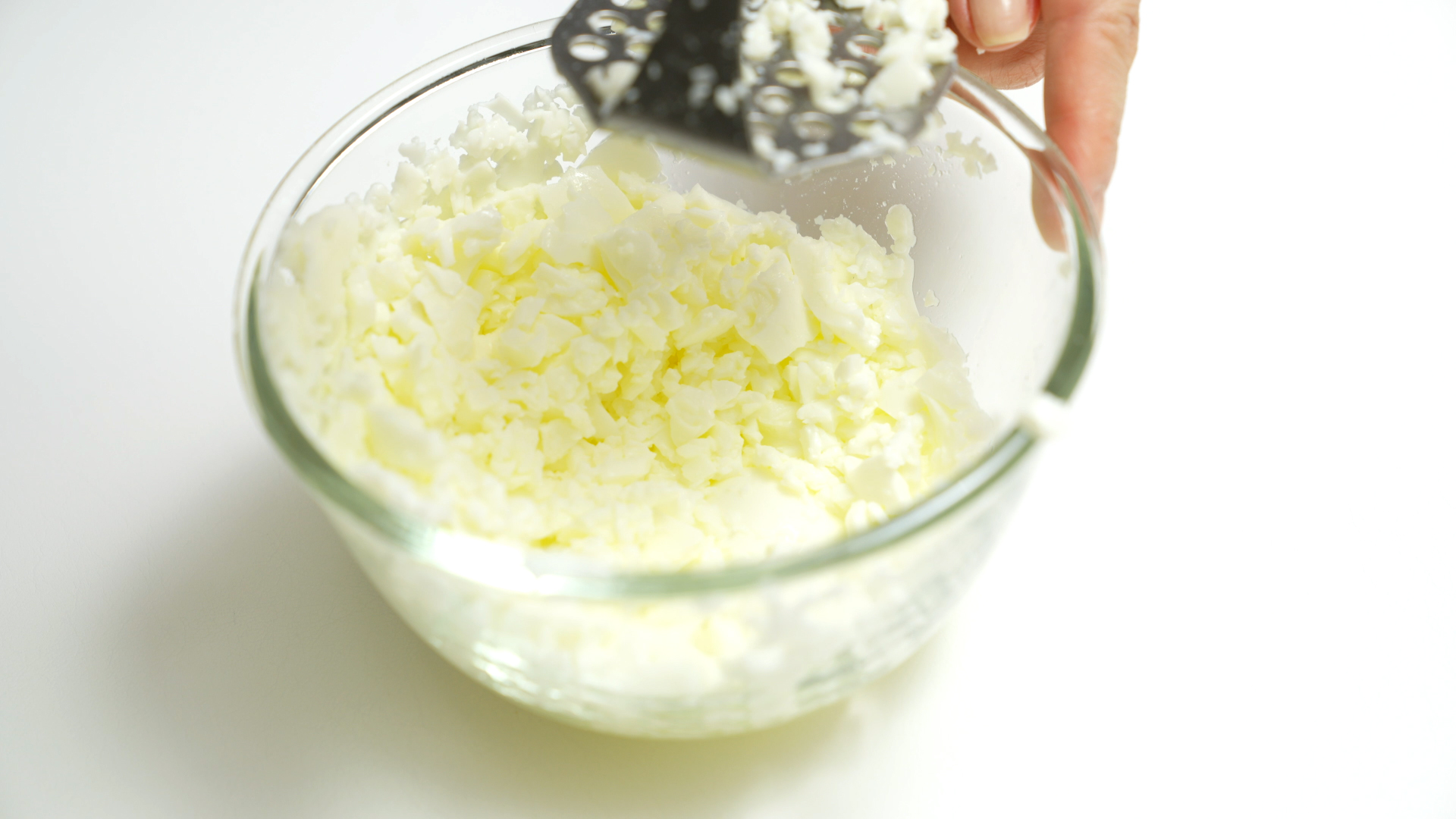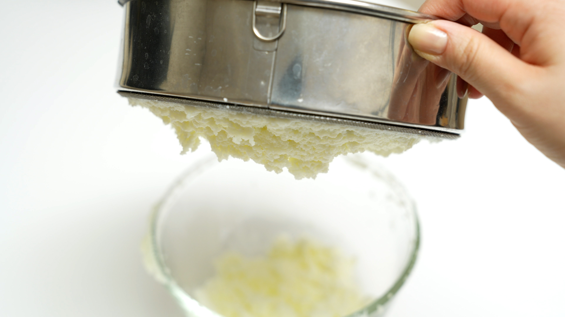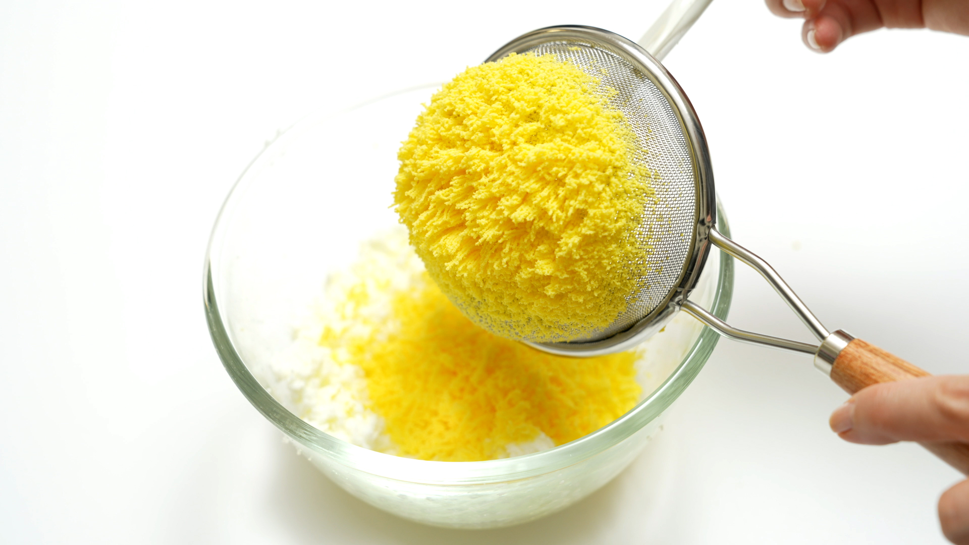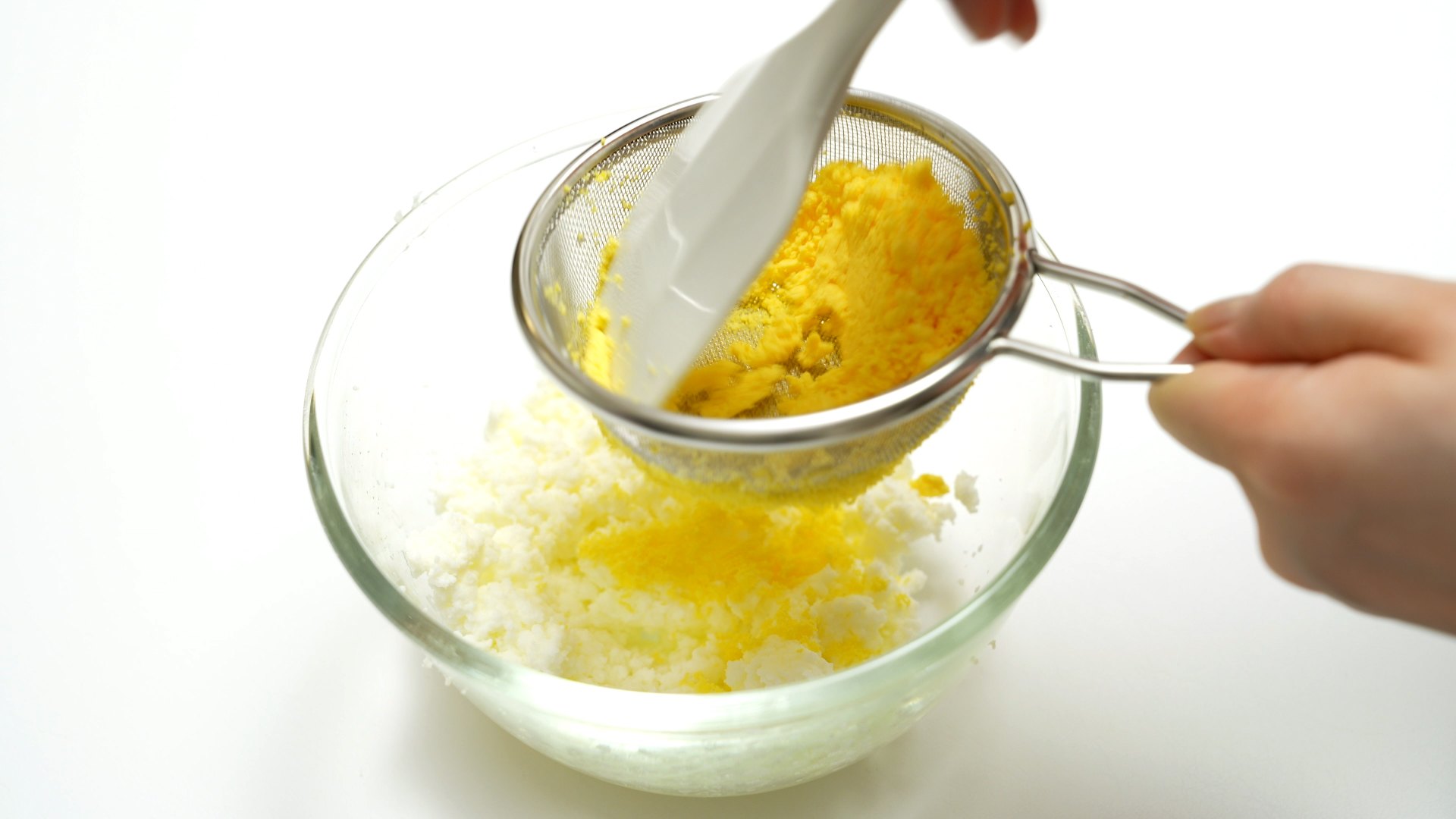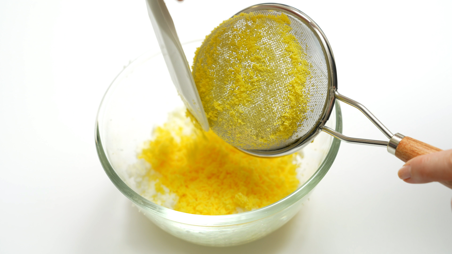 4. 계란 흰자와 노른자를 으깬 뒤 체망을 이용해 곱게 갈기.