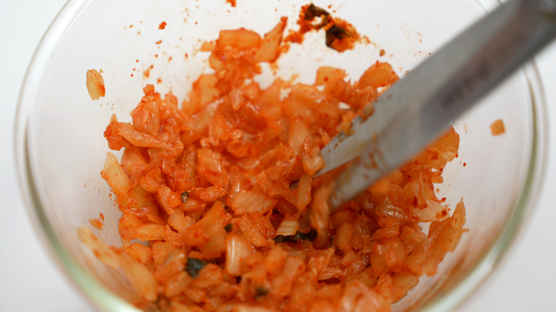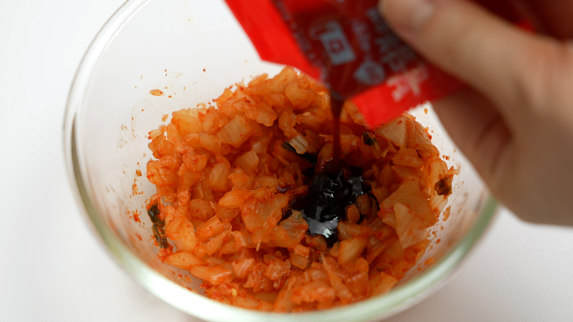 5. 김치 한 줌을 잘게 자르고 불닭소스 넣기.
