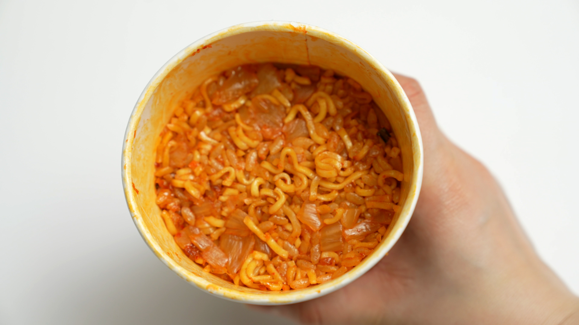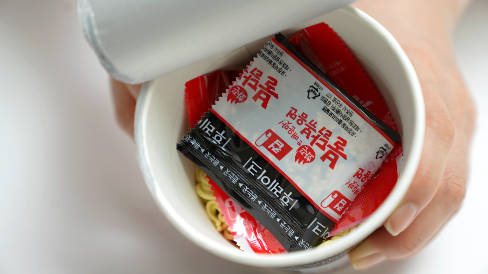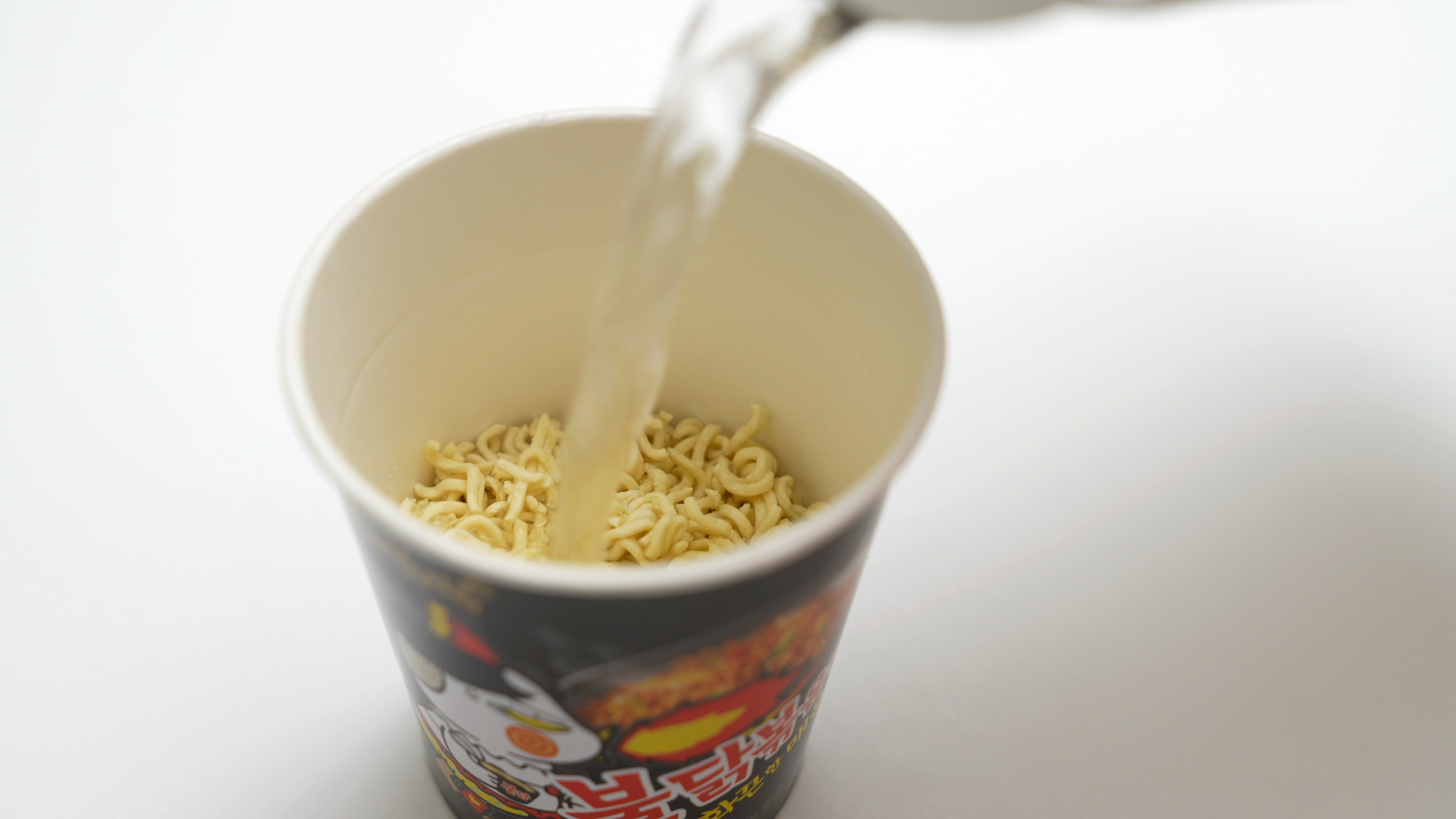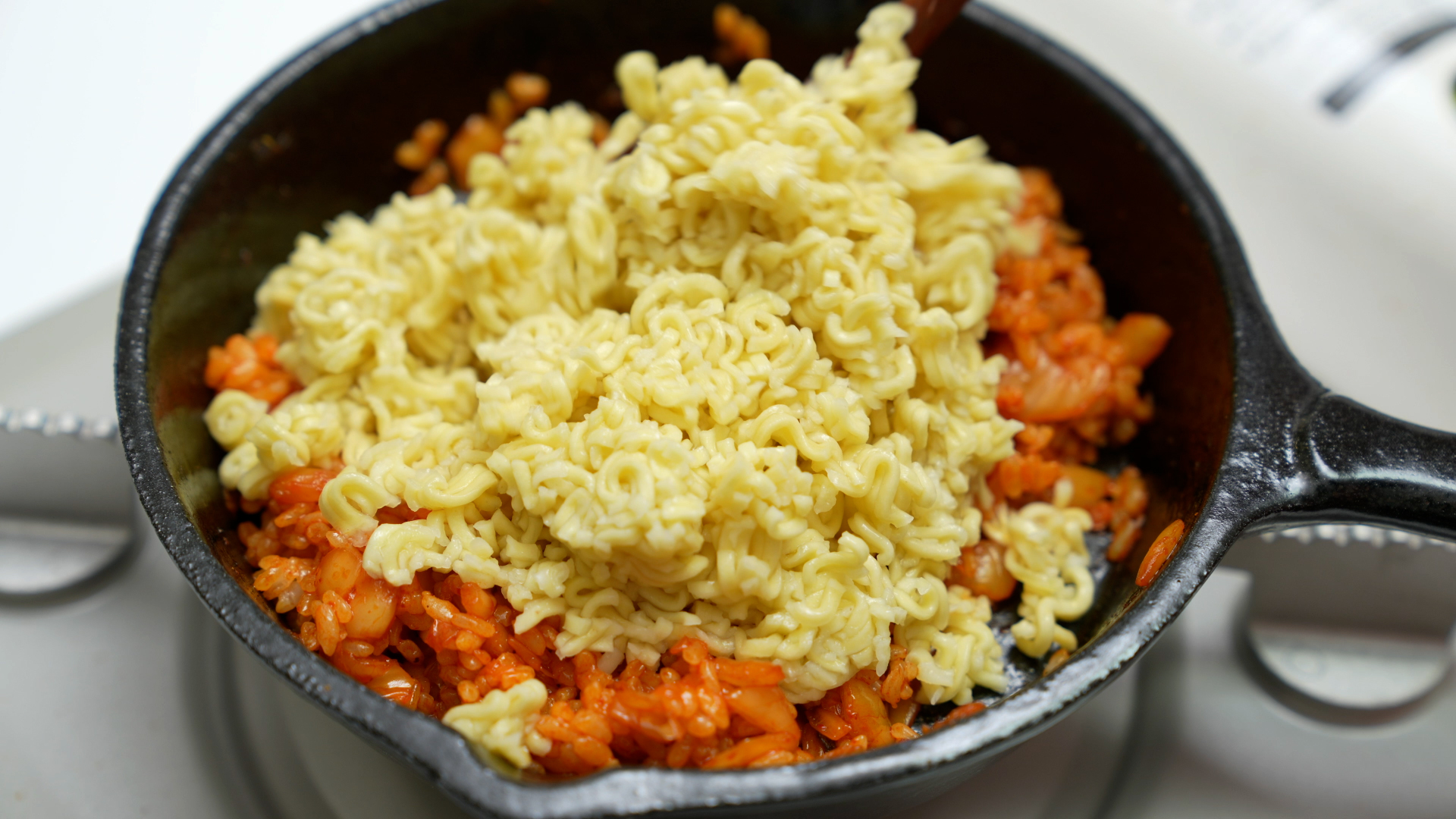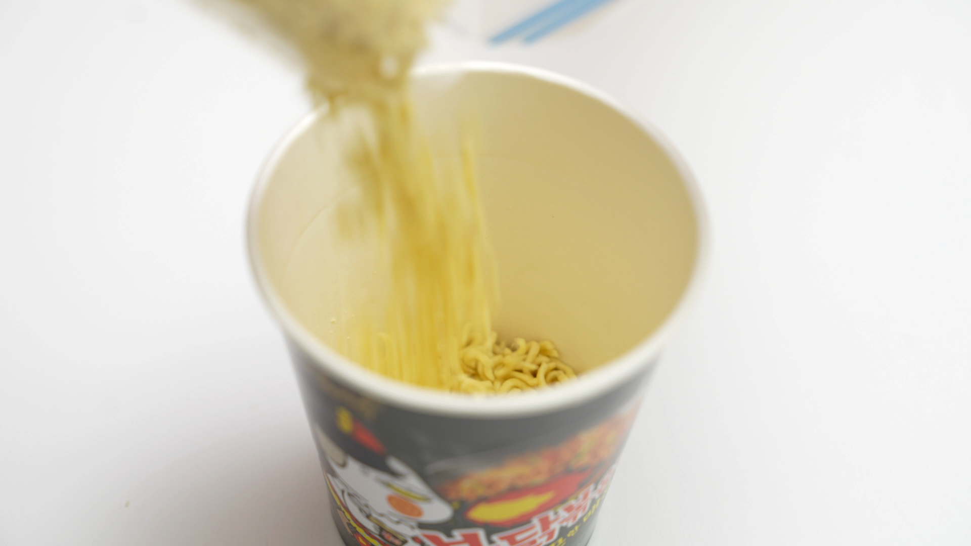 잘게 부순 면에 끓는 물을 부어 30초만 익힌 뒤 물을 빼주세요.