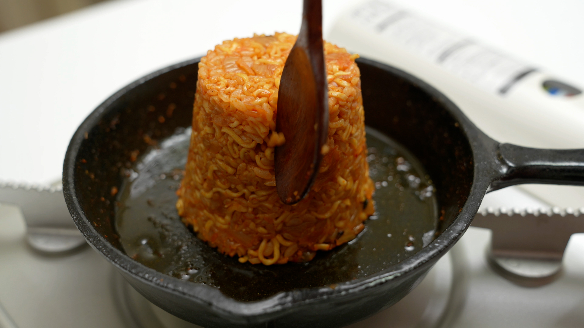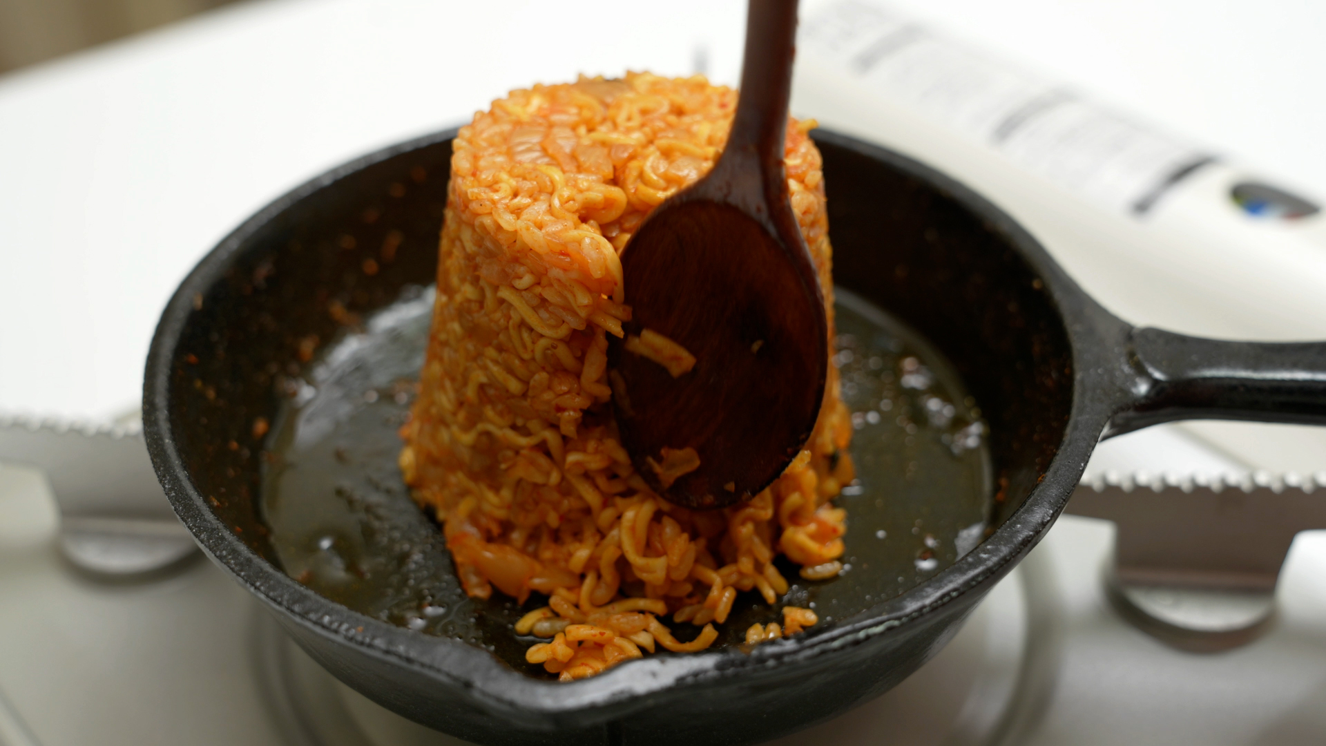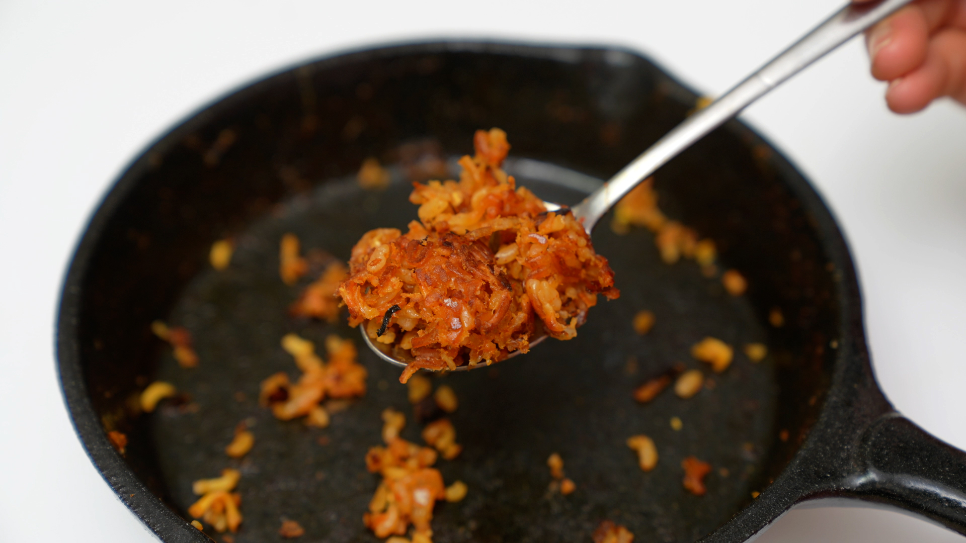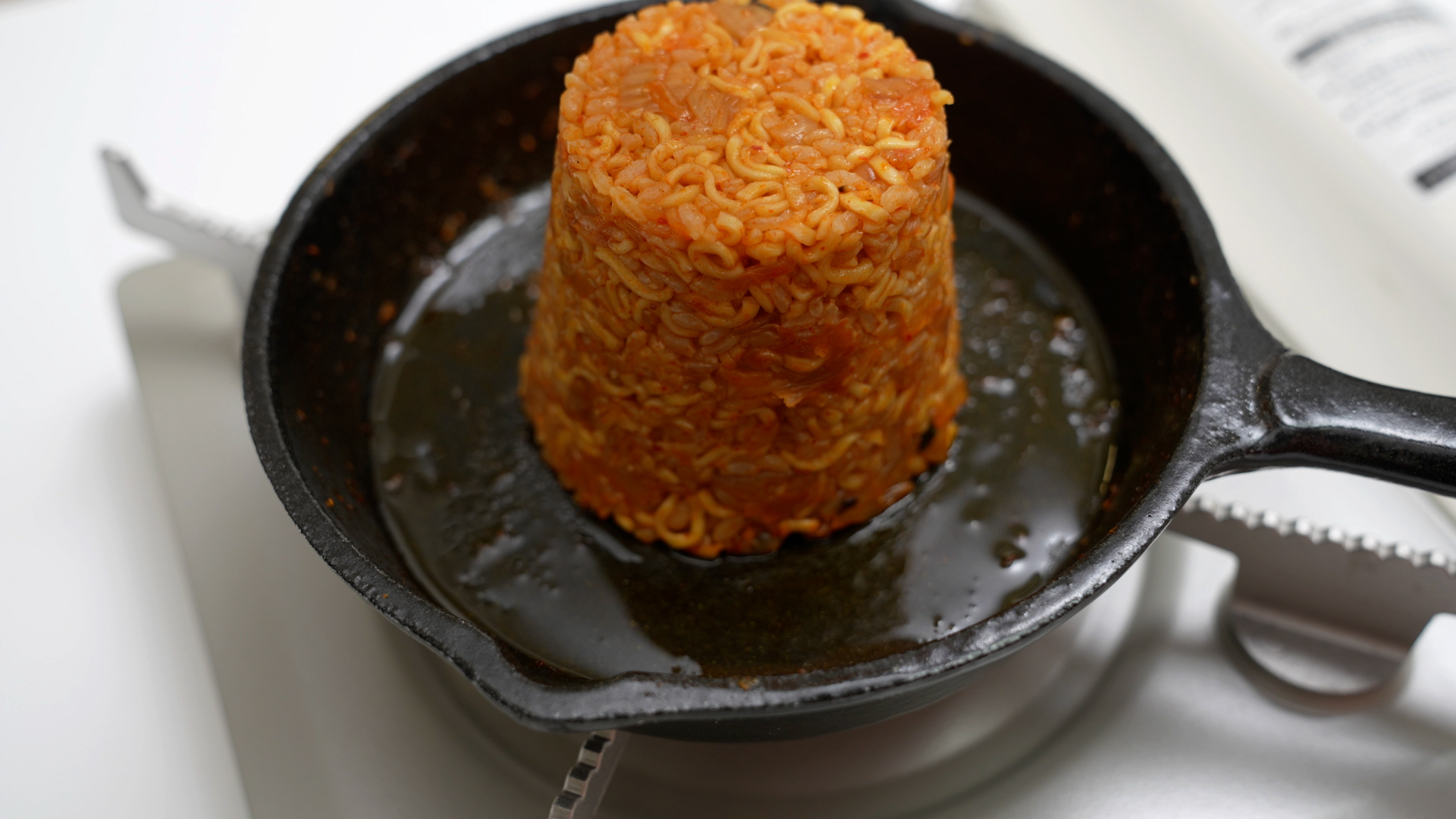 기름 두른 팬에 꾹꾹 누른 컵밥을 뒤집어 올리고,