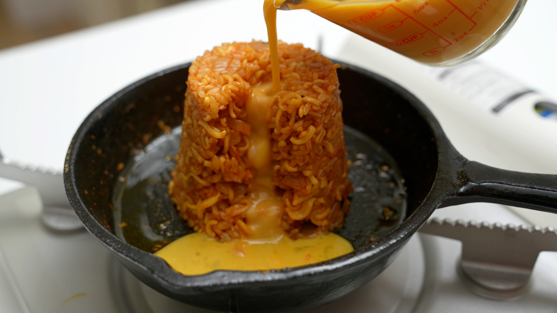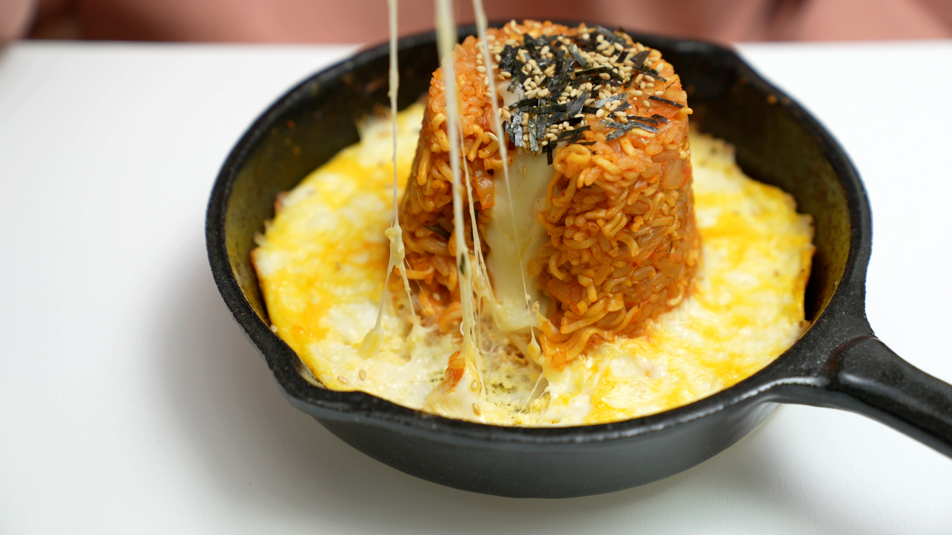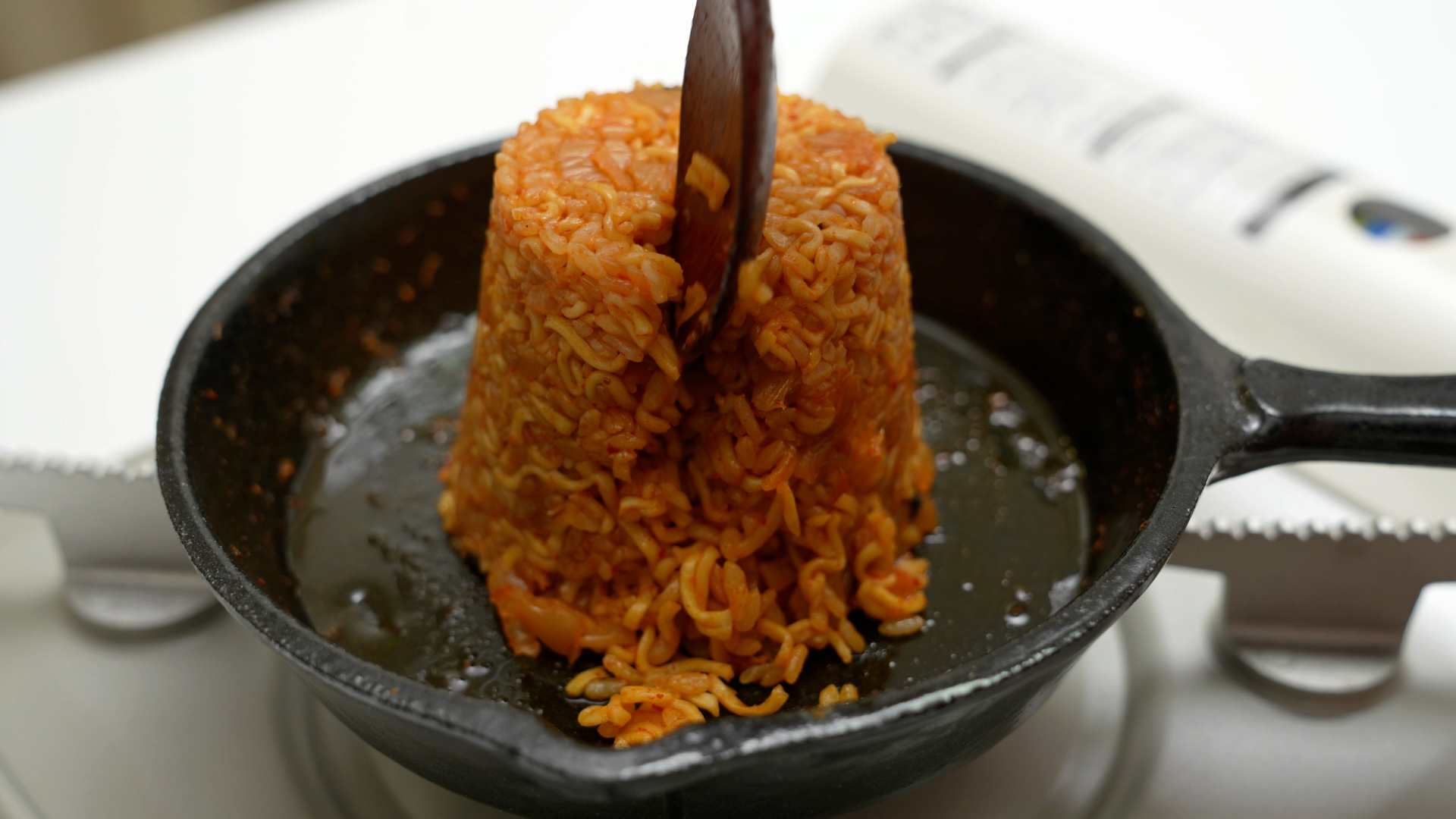 기름 두른 팬에 꾹꾹 누른 컵밥을 뒤집어 올리고,