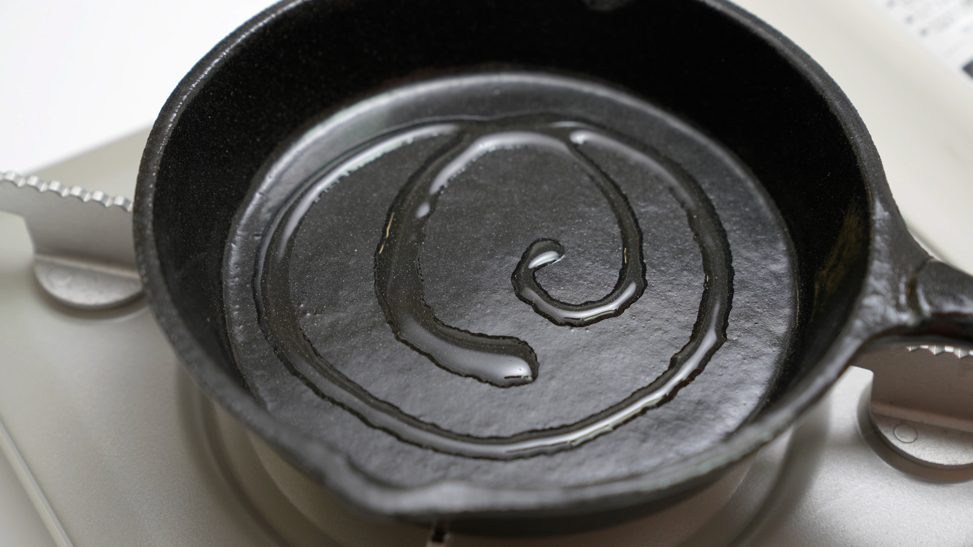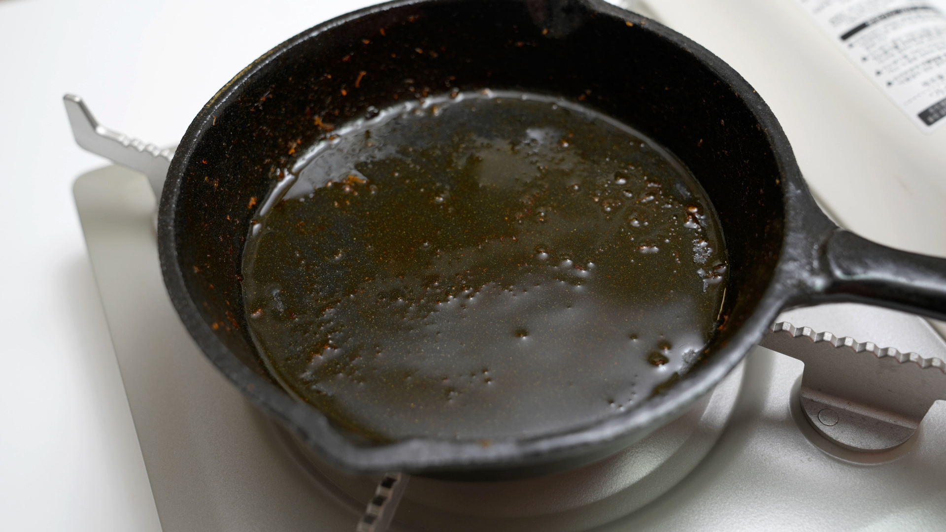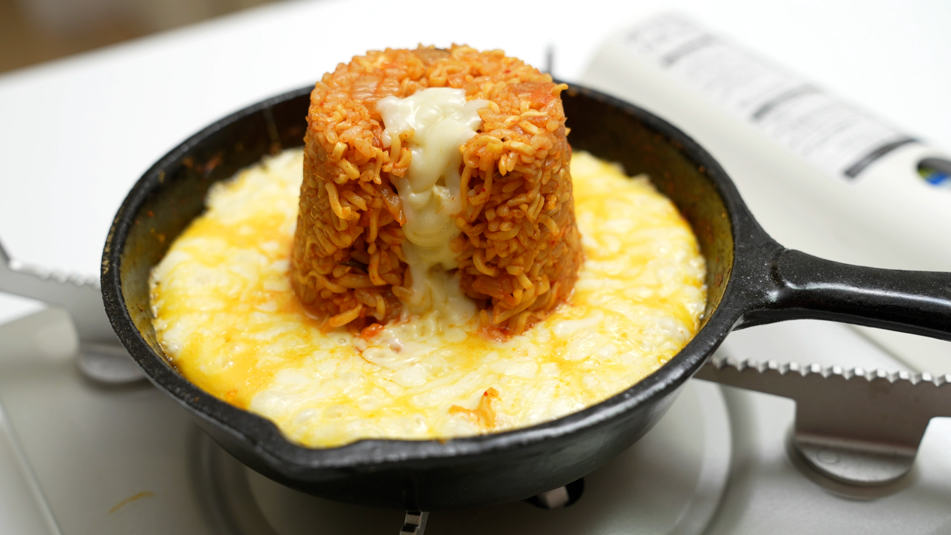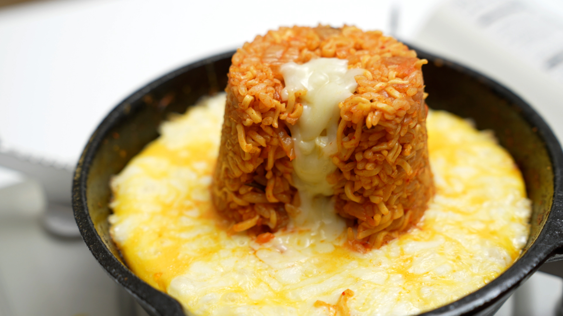 기름 두른 팬에 꾹꾹 누른 컵밥을 뒤집어 올리고,