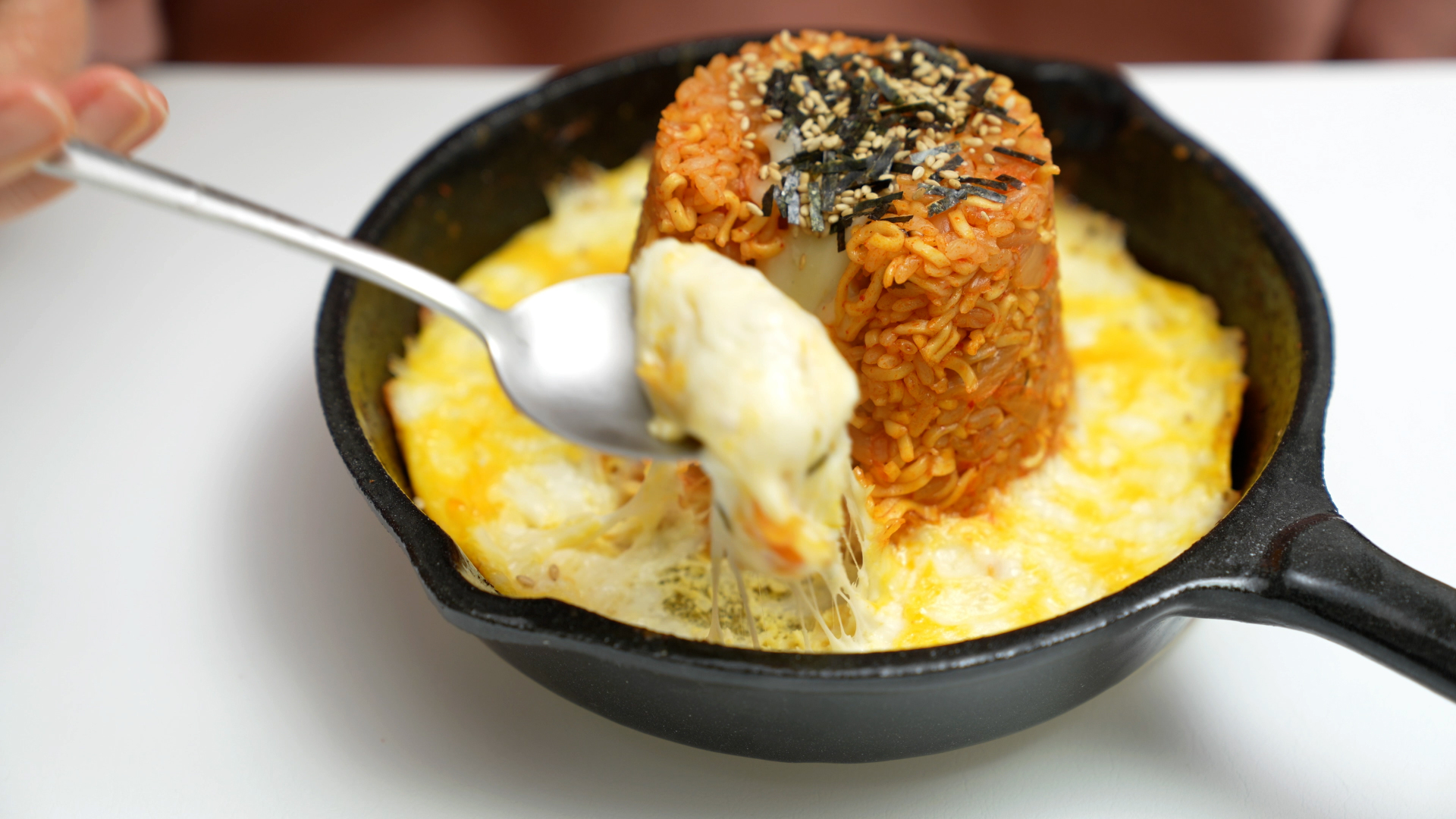 내열유리로 된 유리 볼이나 뚜껑을 덮어 치즈가 녹을 때까지 익혀주면 완성입니다.