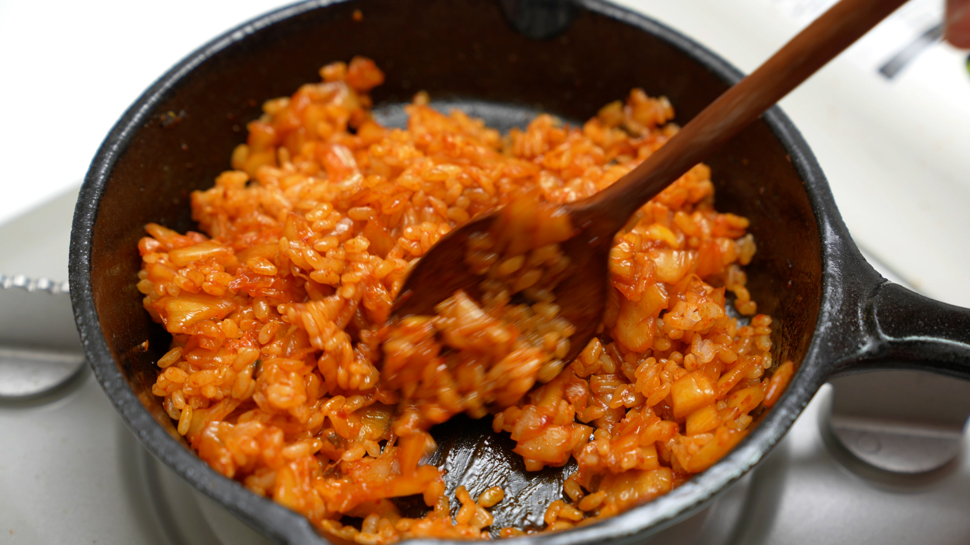 기름 두른 팬에 김치를 넣고 타지 않게 볶아주세요.