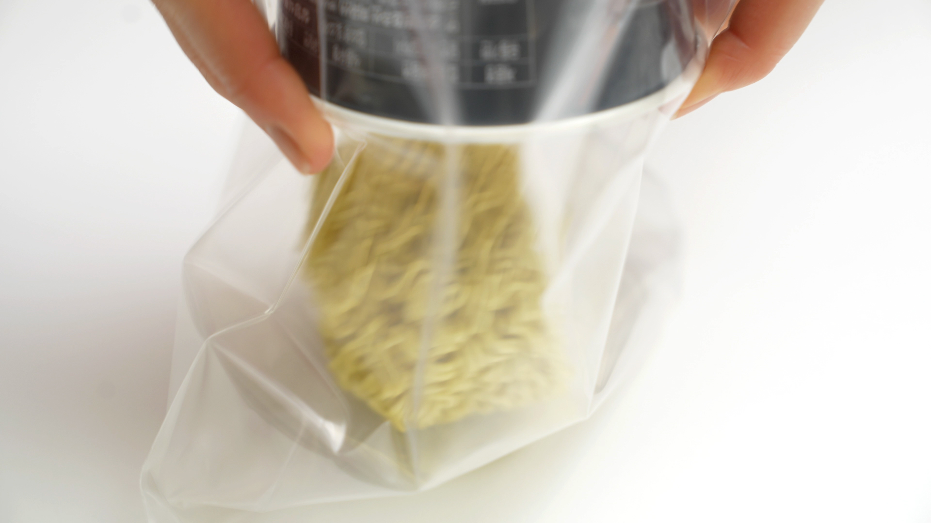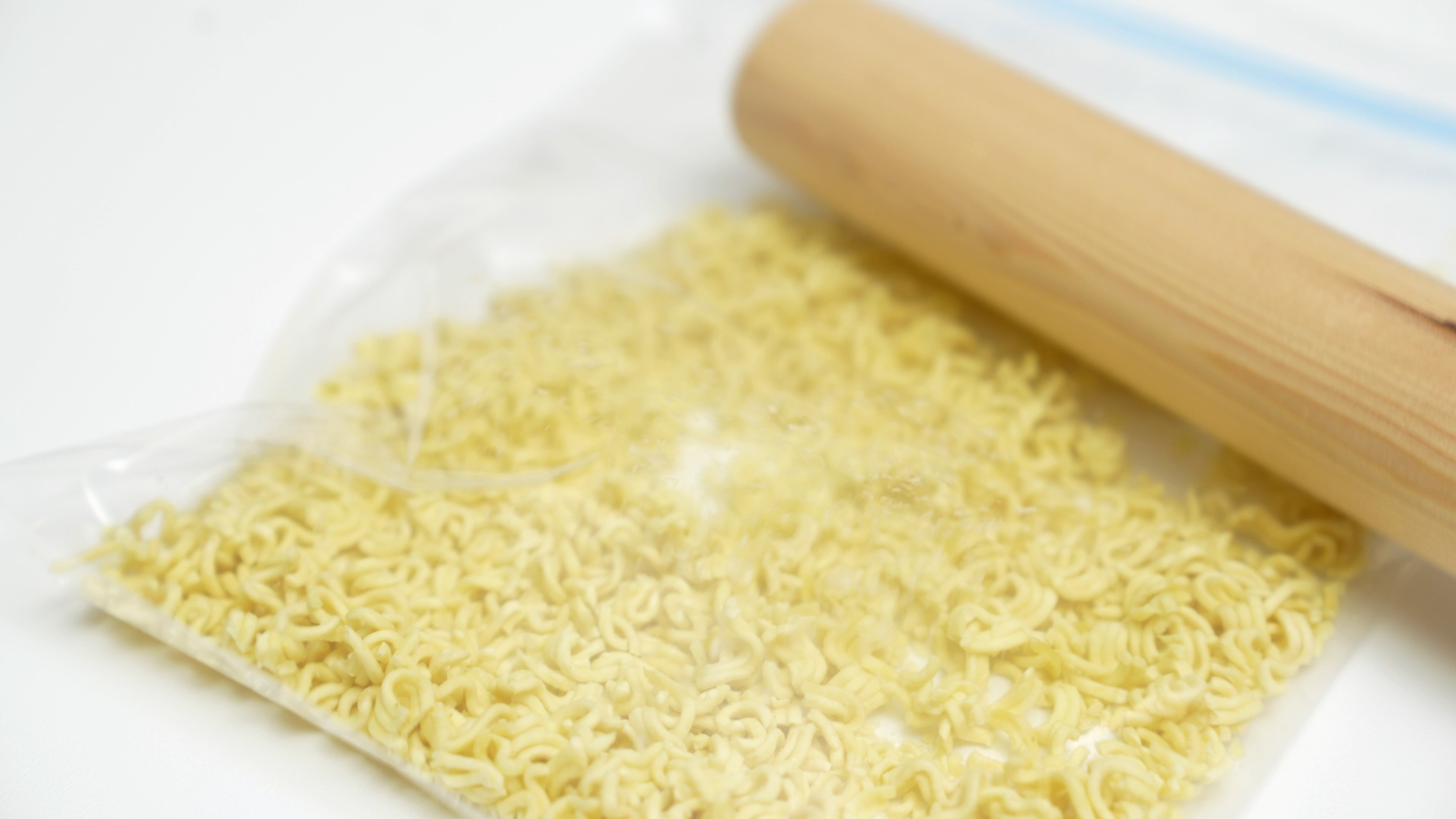2. 면을 지퍼백에 넣어 잘게 부수기.
