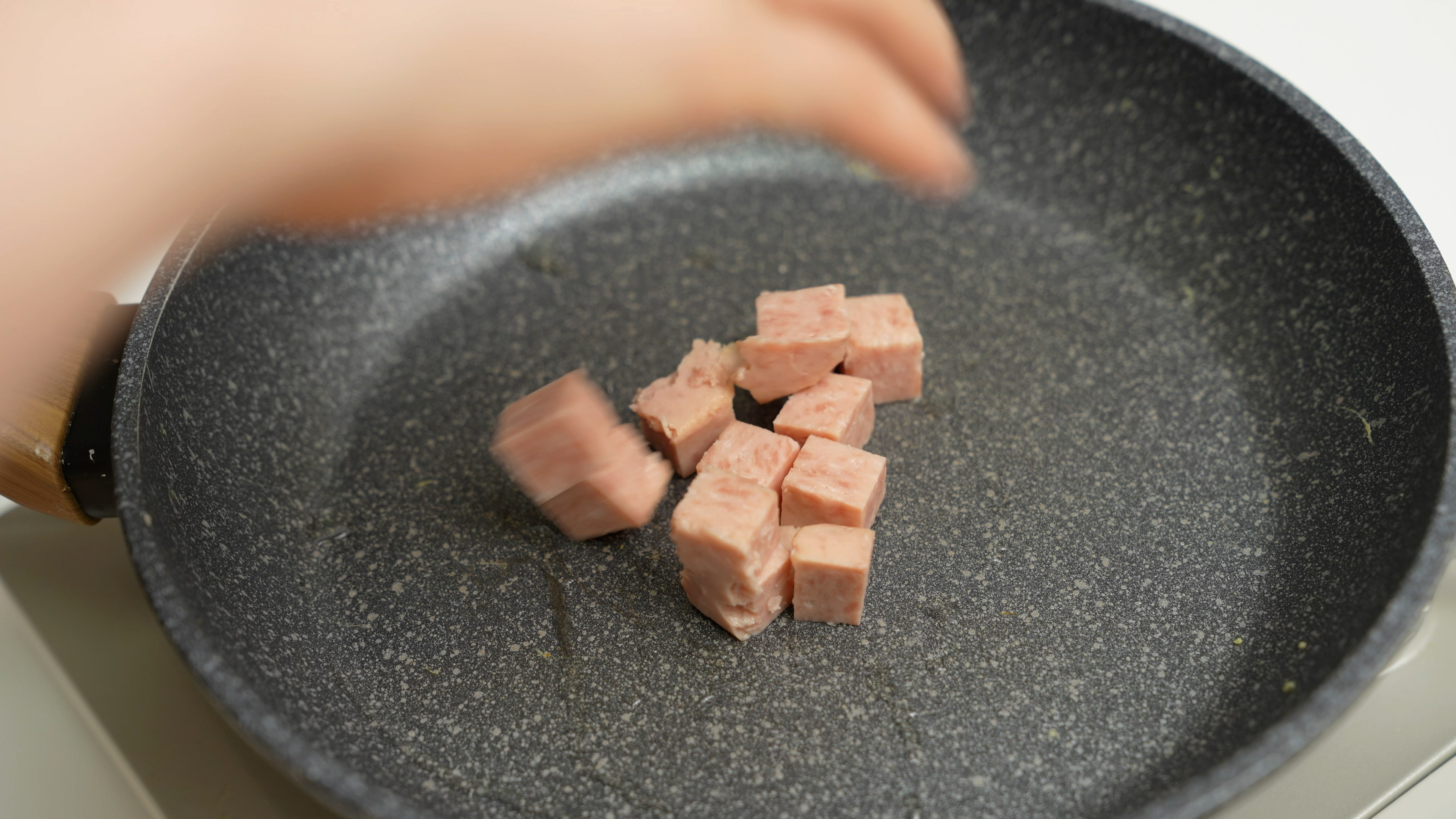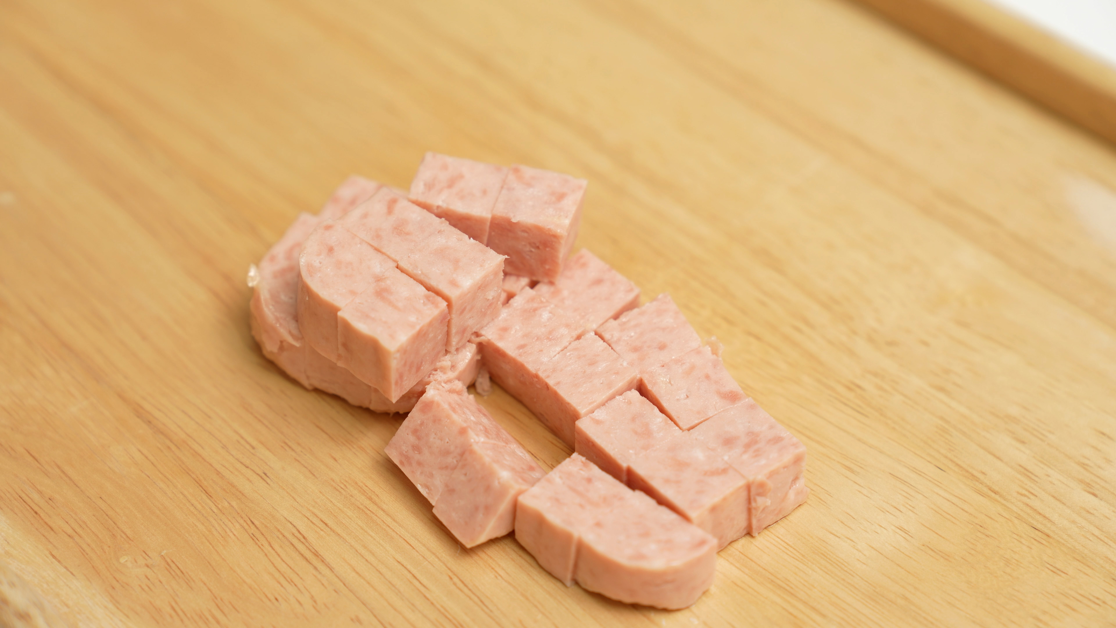 1. 스팸 반개를 3등분, 3등분 하여 큐브 모양으로 썰기.
