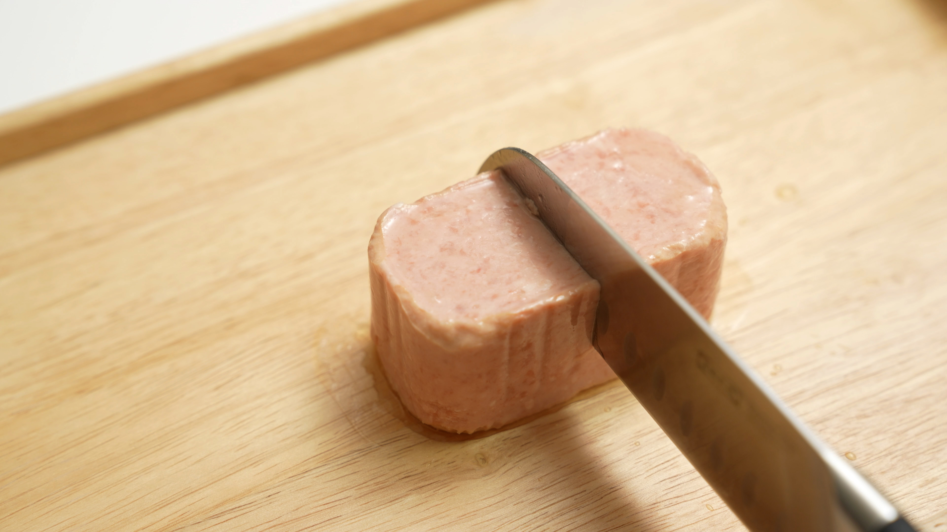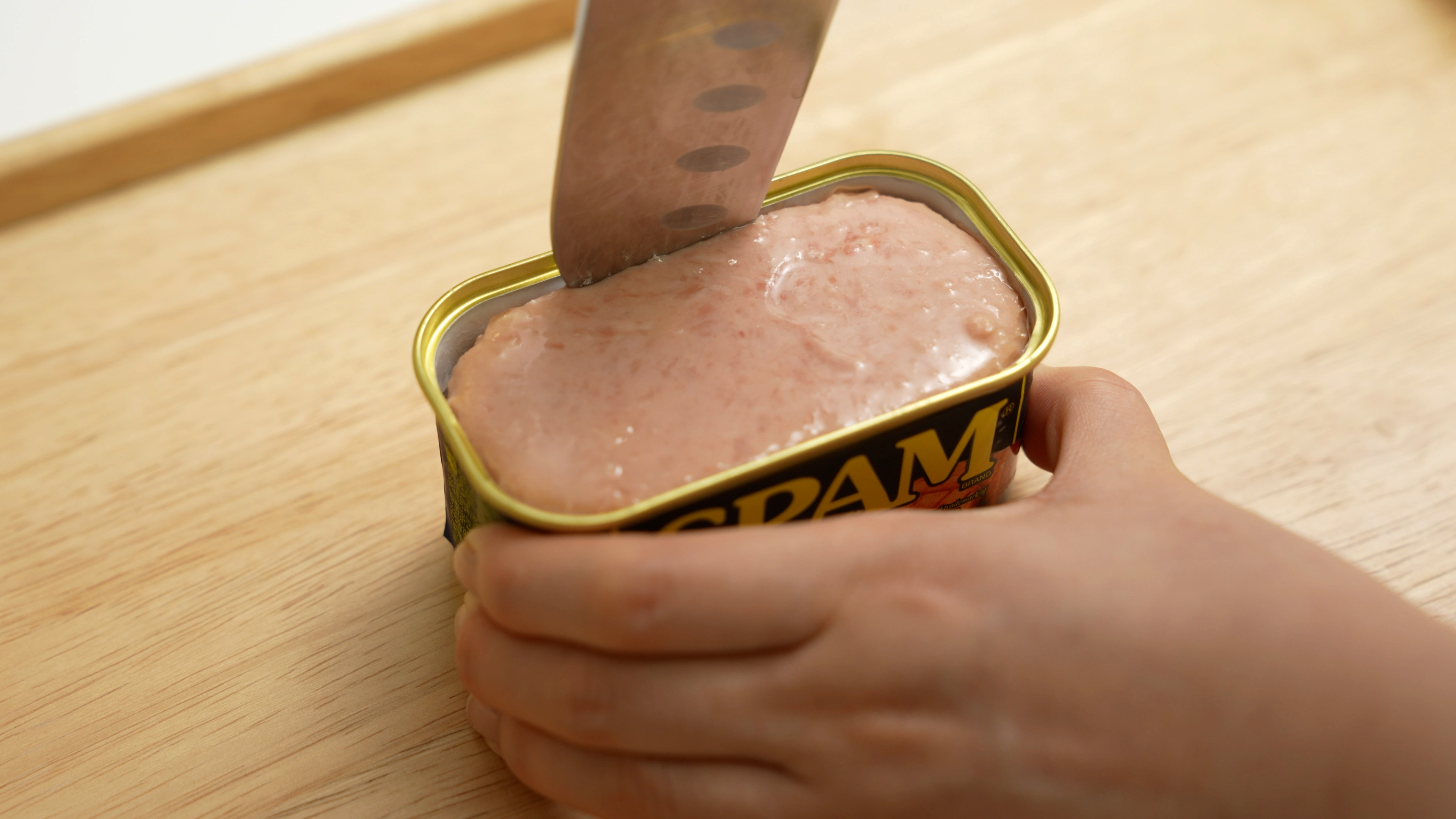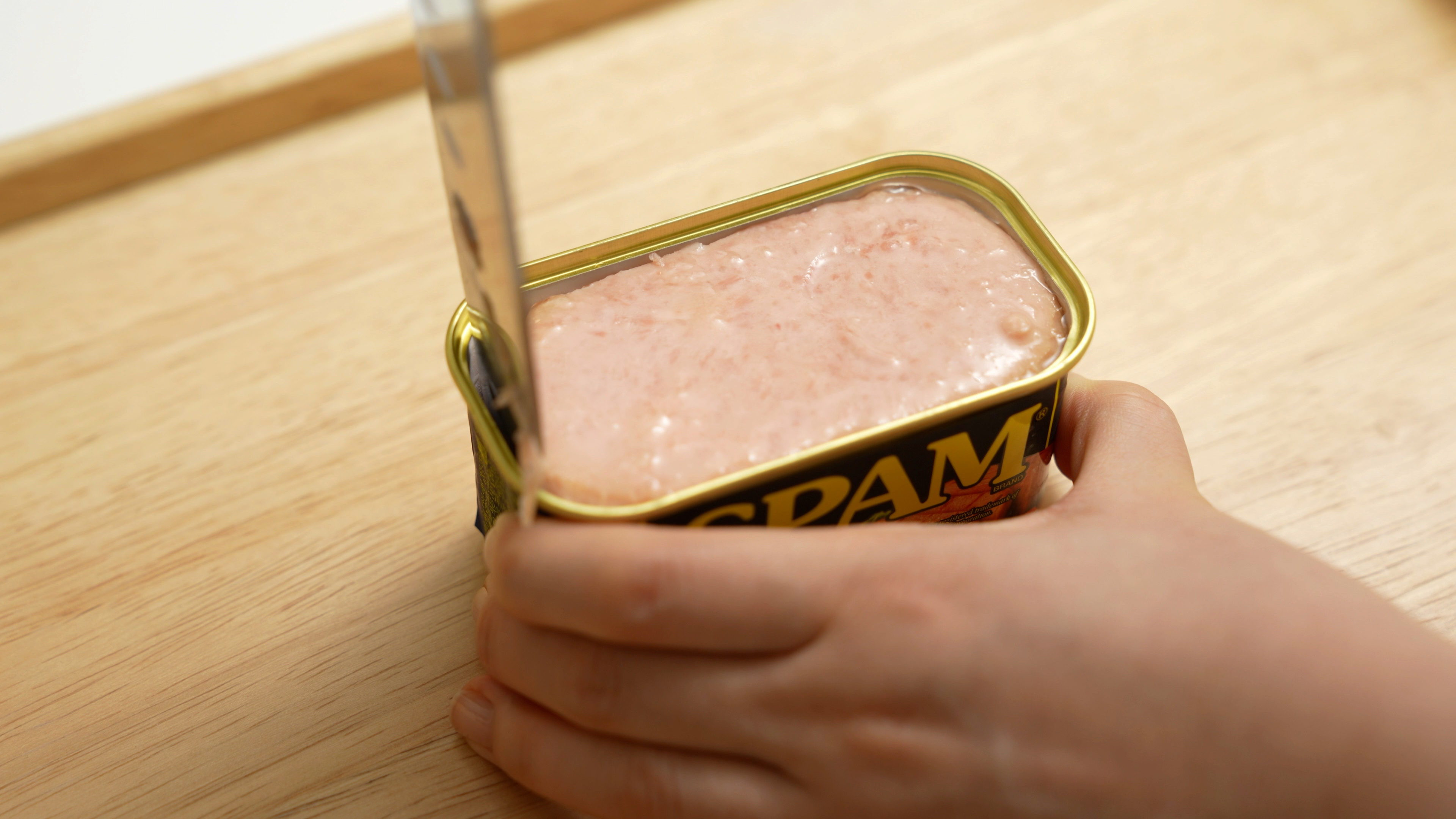 스팸은 4면을 칼로 한 번씩 넣었다 빼주면 손쉽게 뺄 수 있어요.