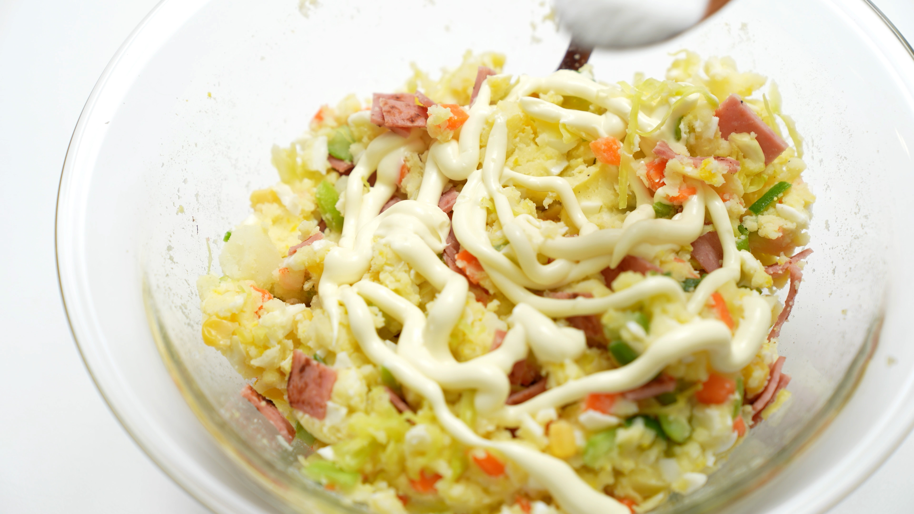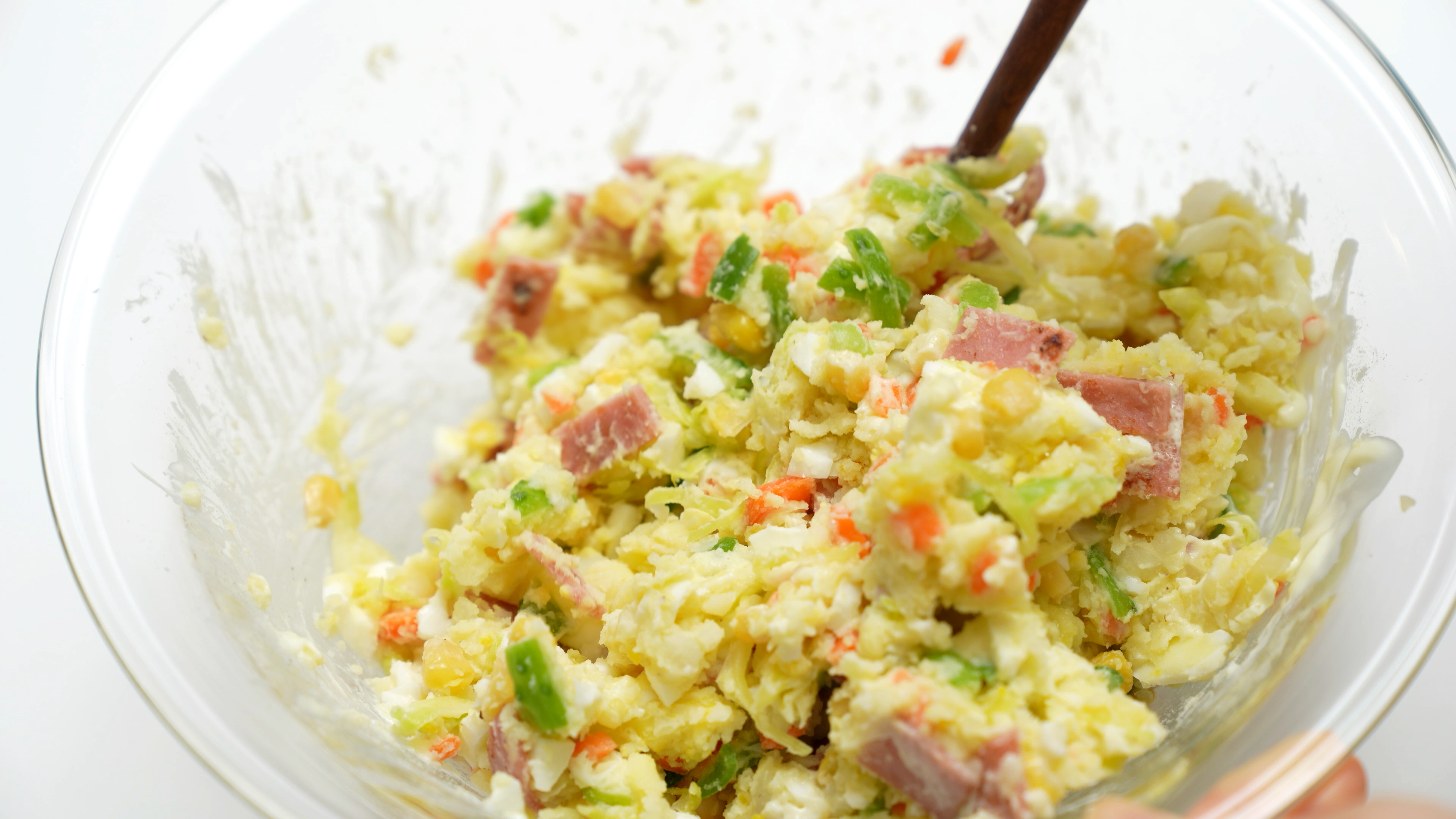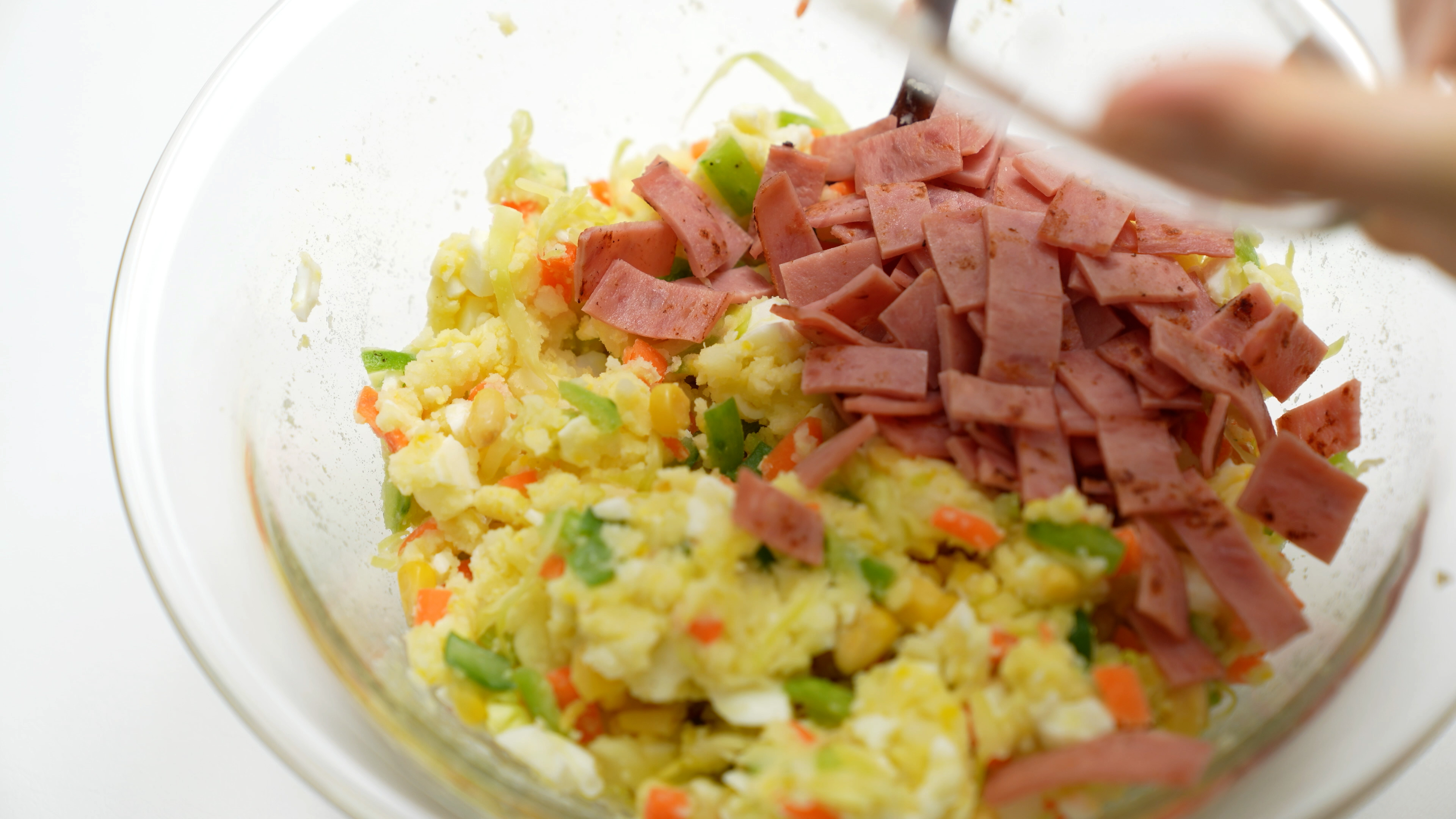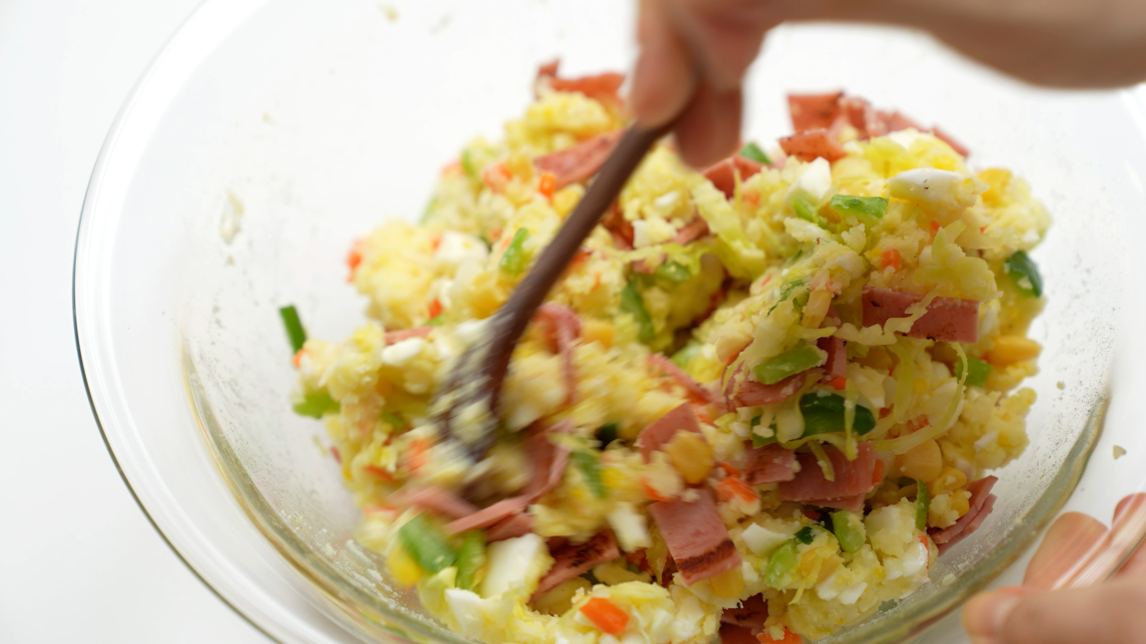 감자와 계란을 섞은 볼에 야채, 스위트콘, 햄을 넣고,
