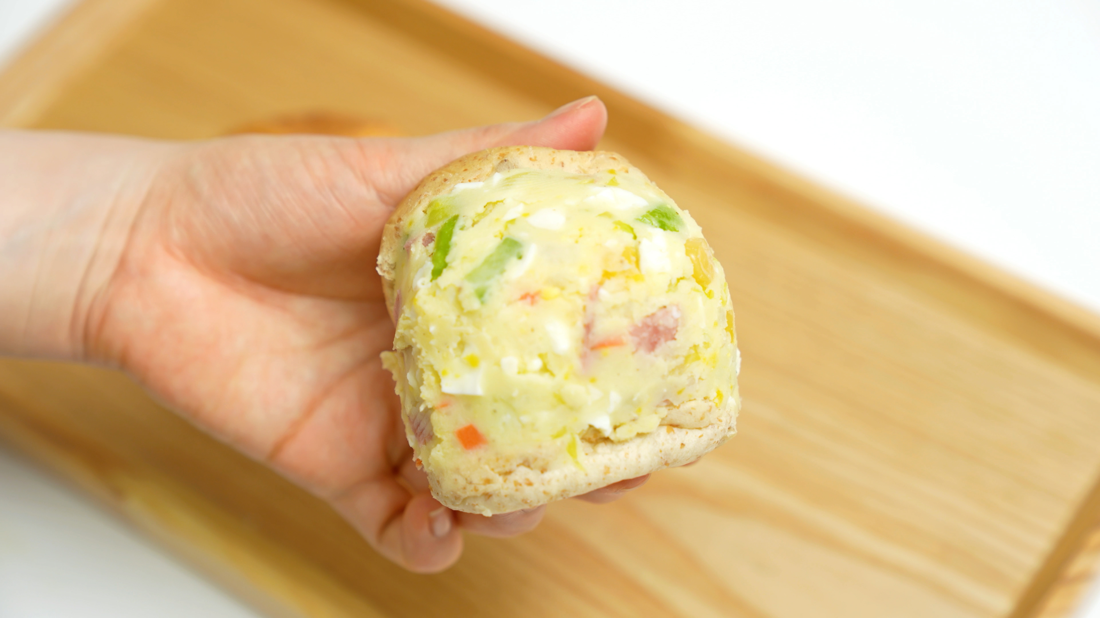 토핑을 듬뿍! 넣어주면 감자샐러드 모닝빵! 💛