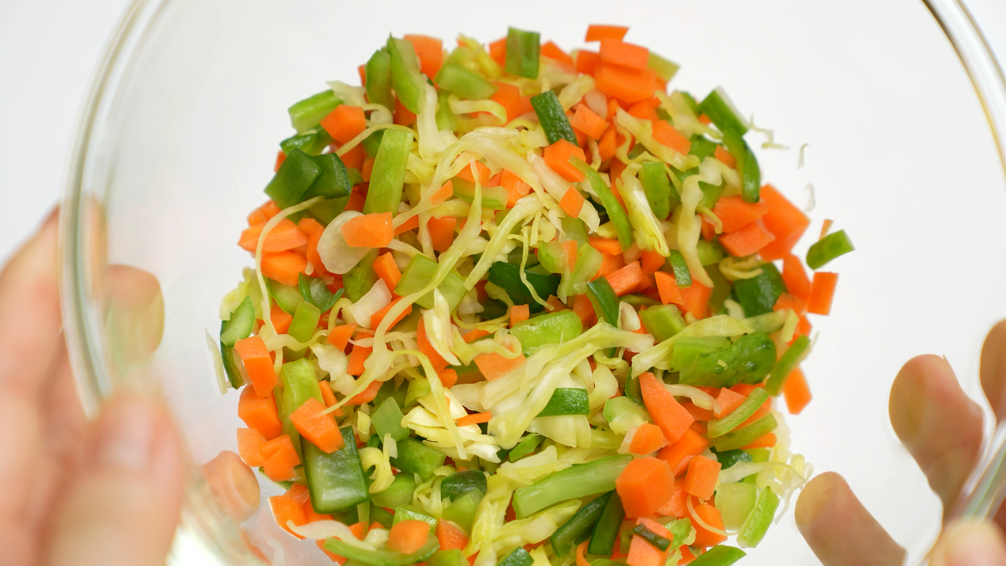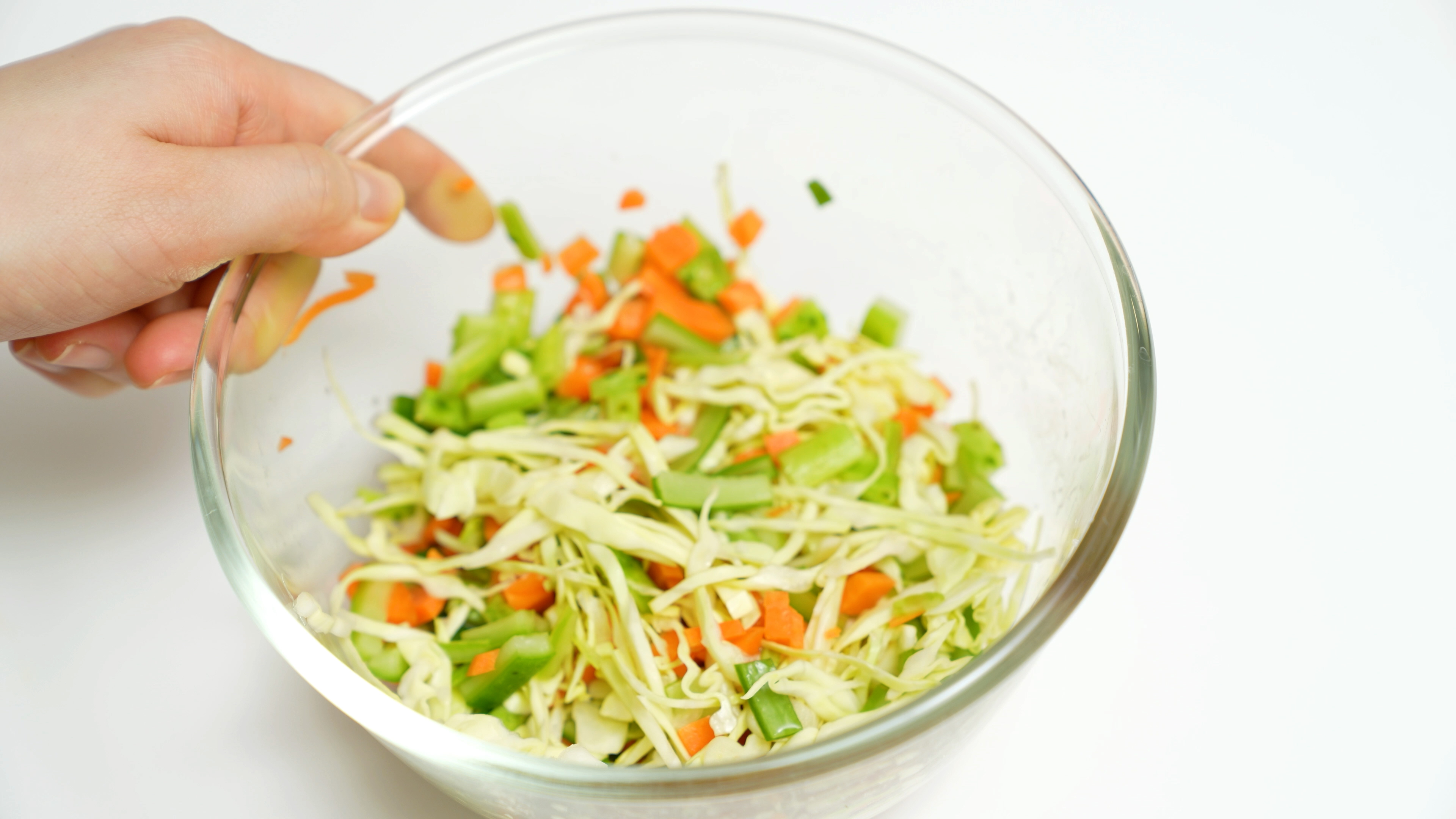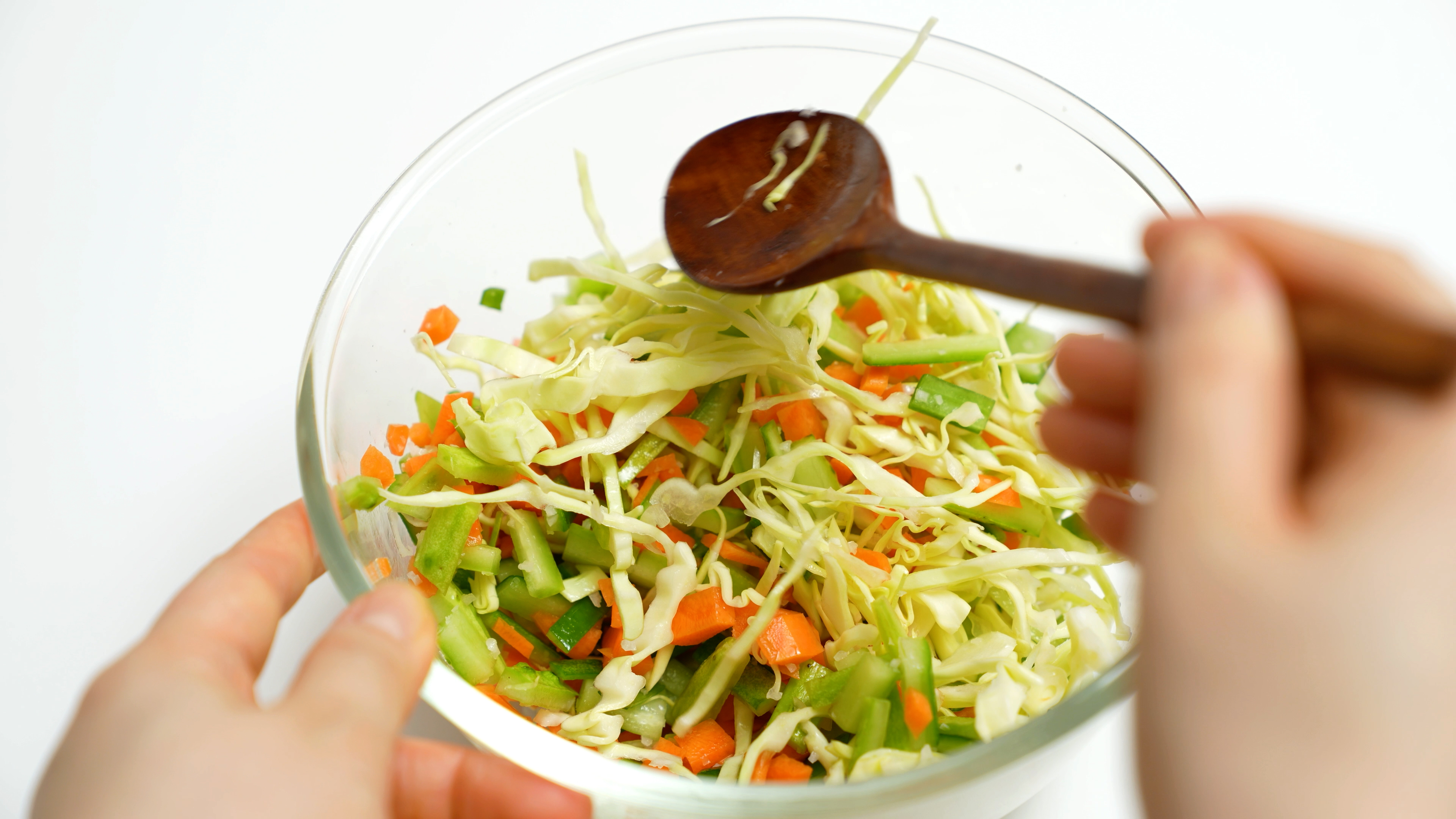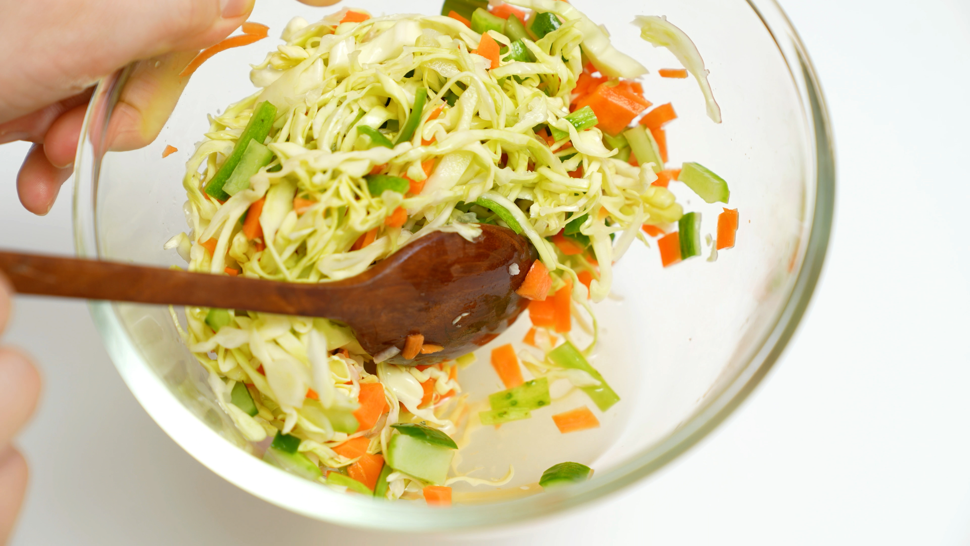 양배추, 오이, 당근을 볼에 넣은 뒤 굵은소금 2스푼 넣어 잘 섞어줍니다.