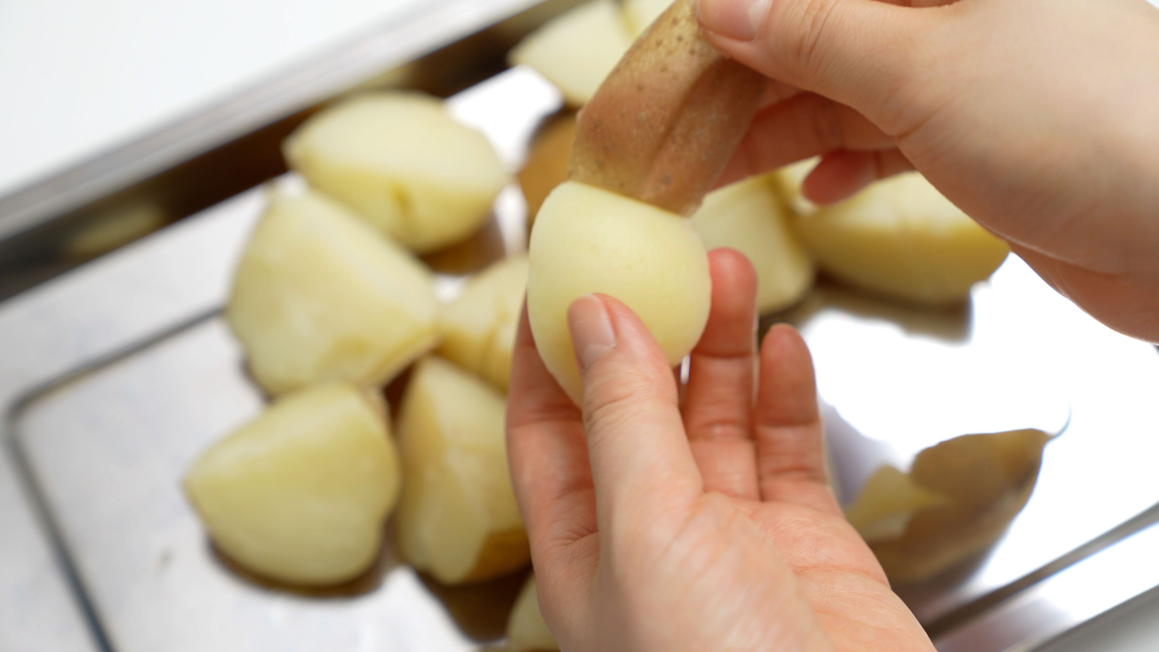 감자를 조금 식힌 후, 껍질을 모두 제거한 뒤,