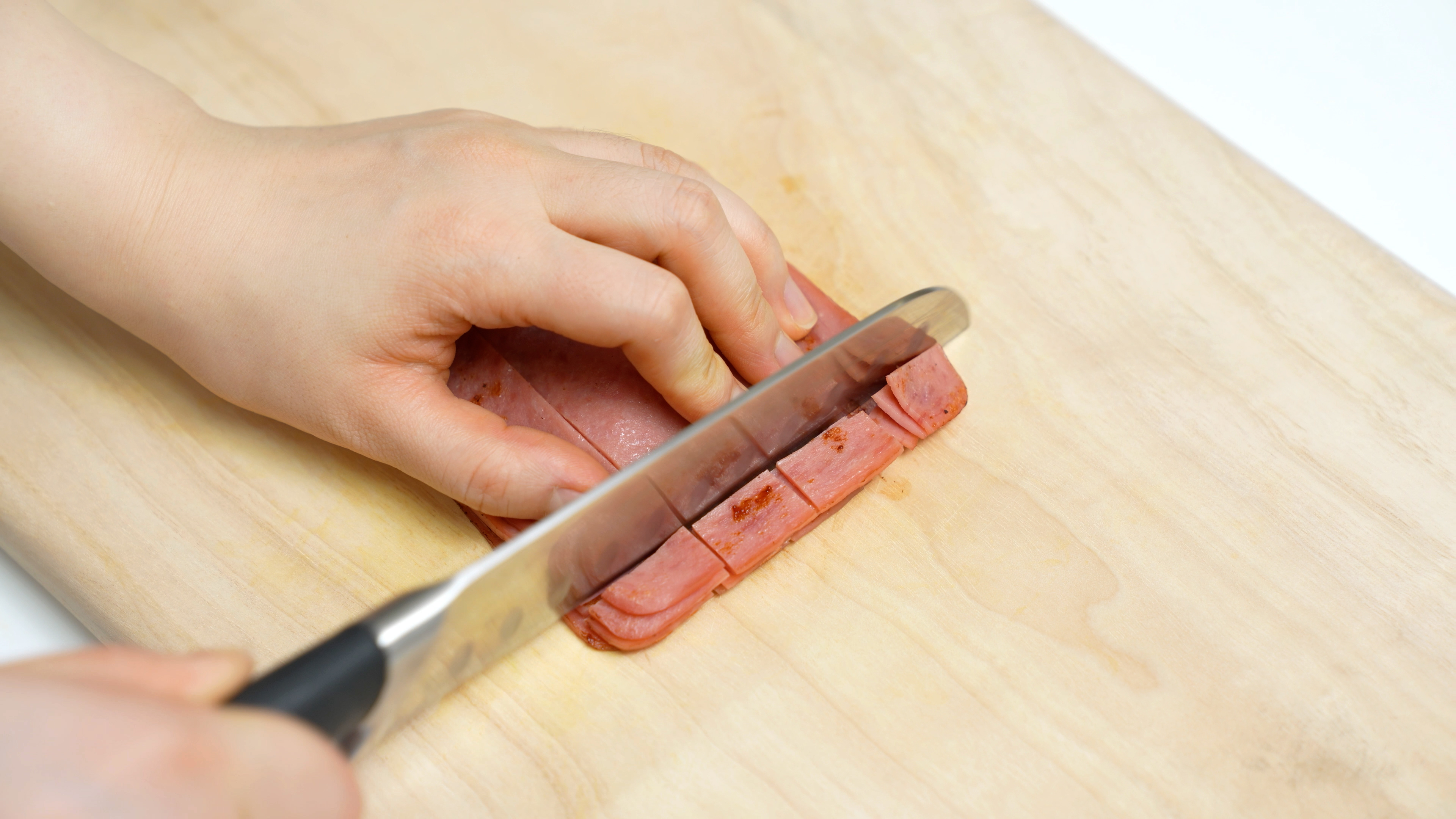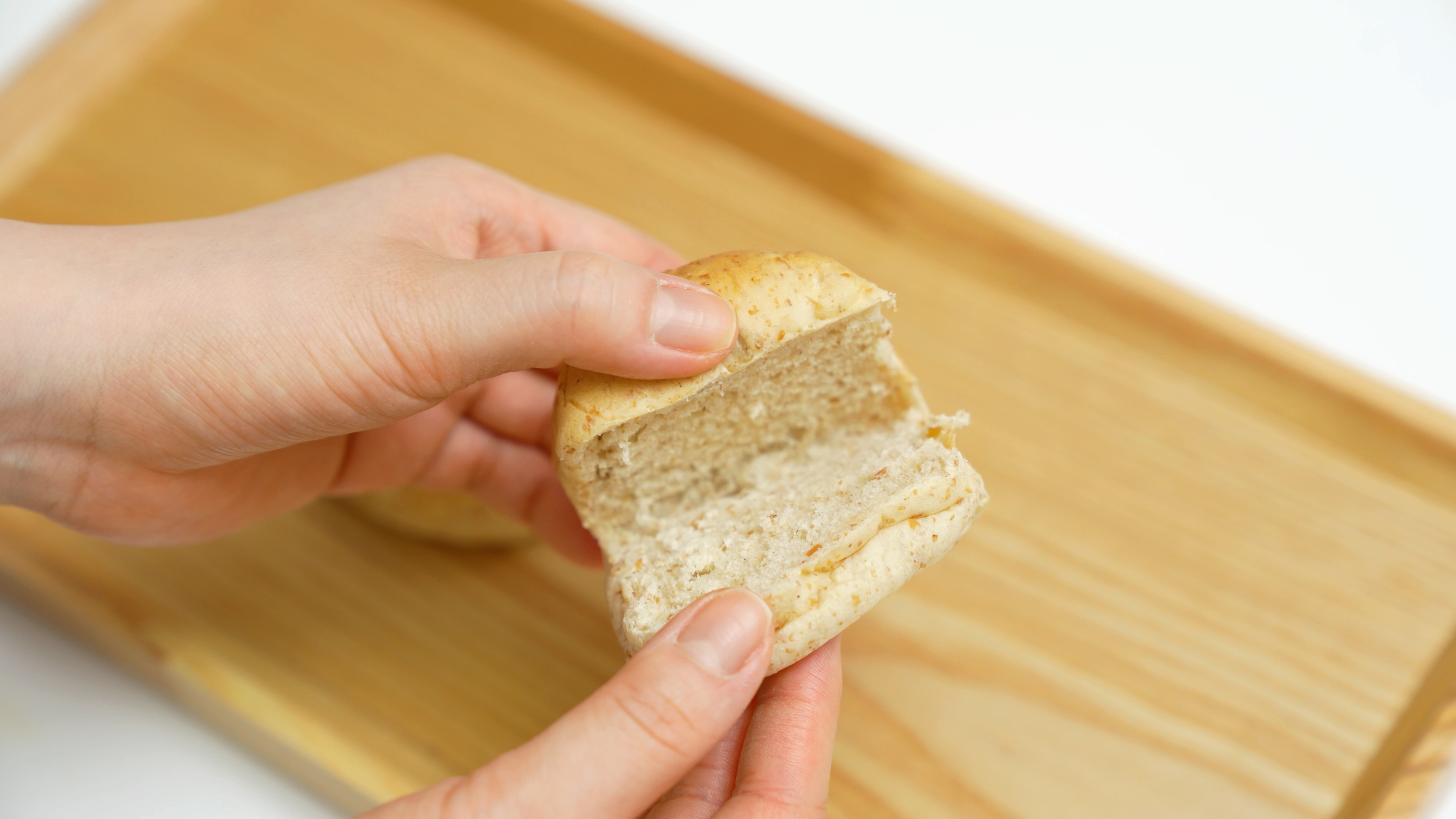 모닝빵은 끝을 조금 남기고 잘라주세요.