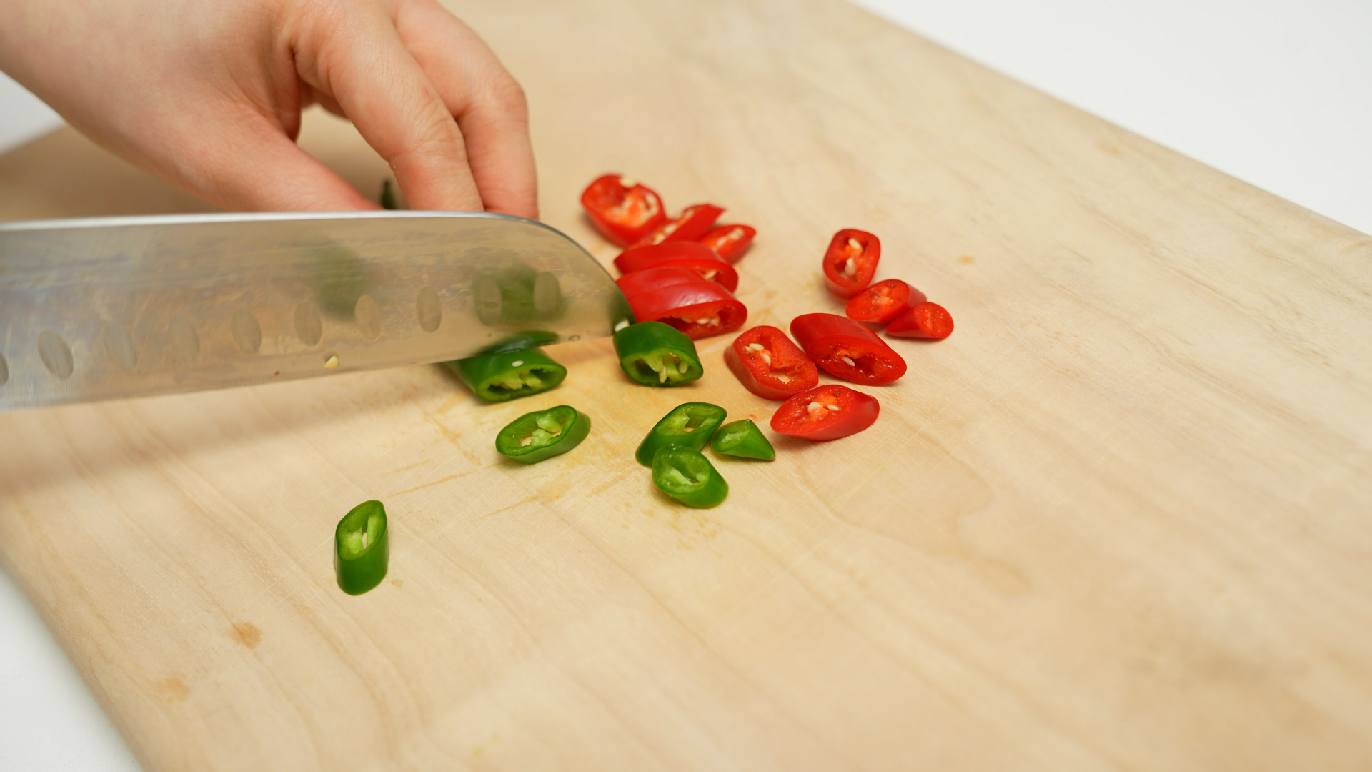 홍고추 1개, 청고추 1개 어슷 썰고,