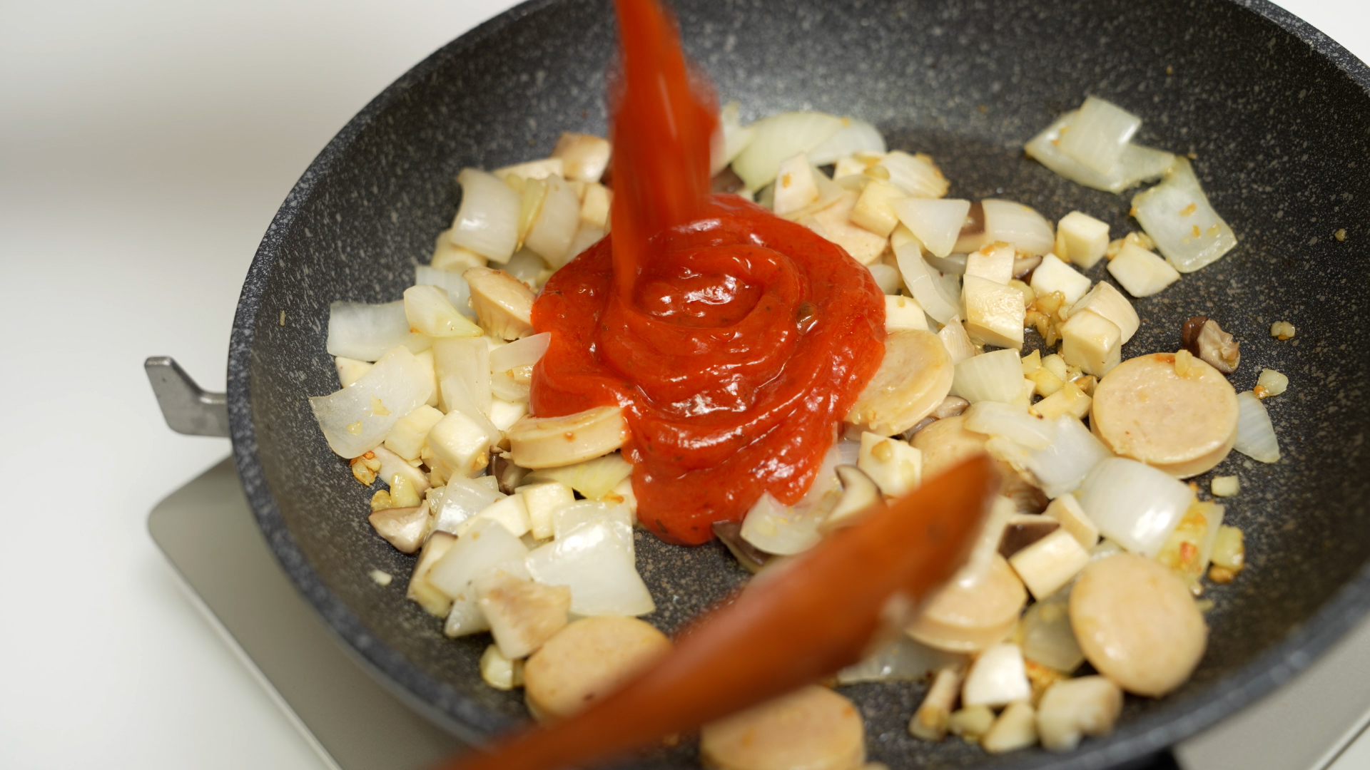 소시지, 새송이버섯 넣고 볶다가, 소금, 후추로 간하기