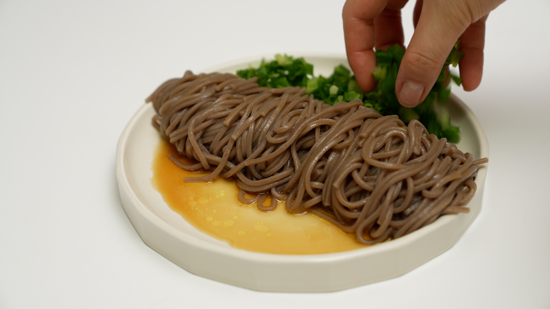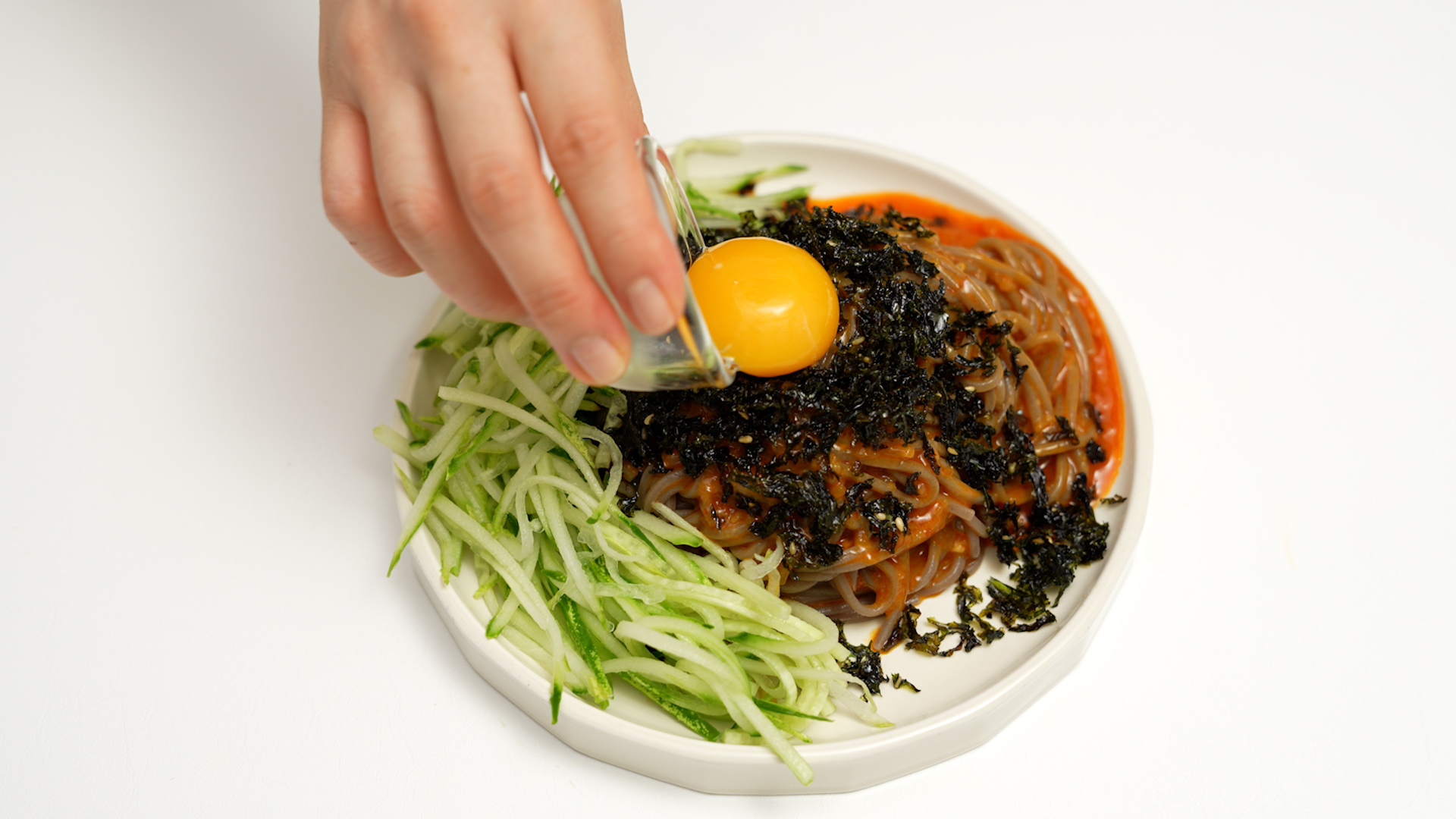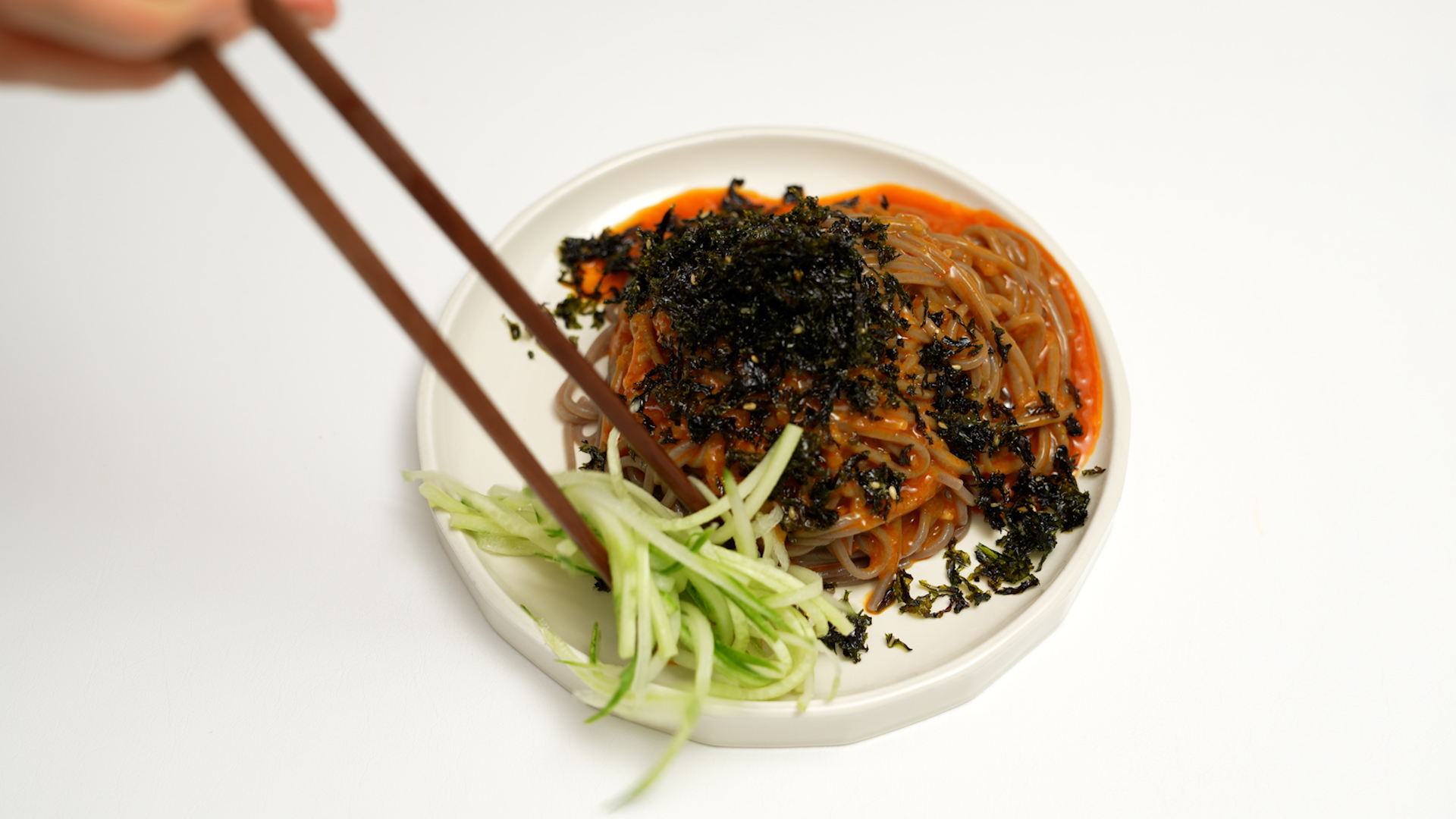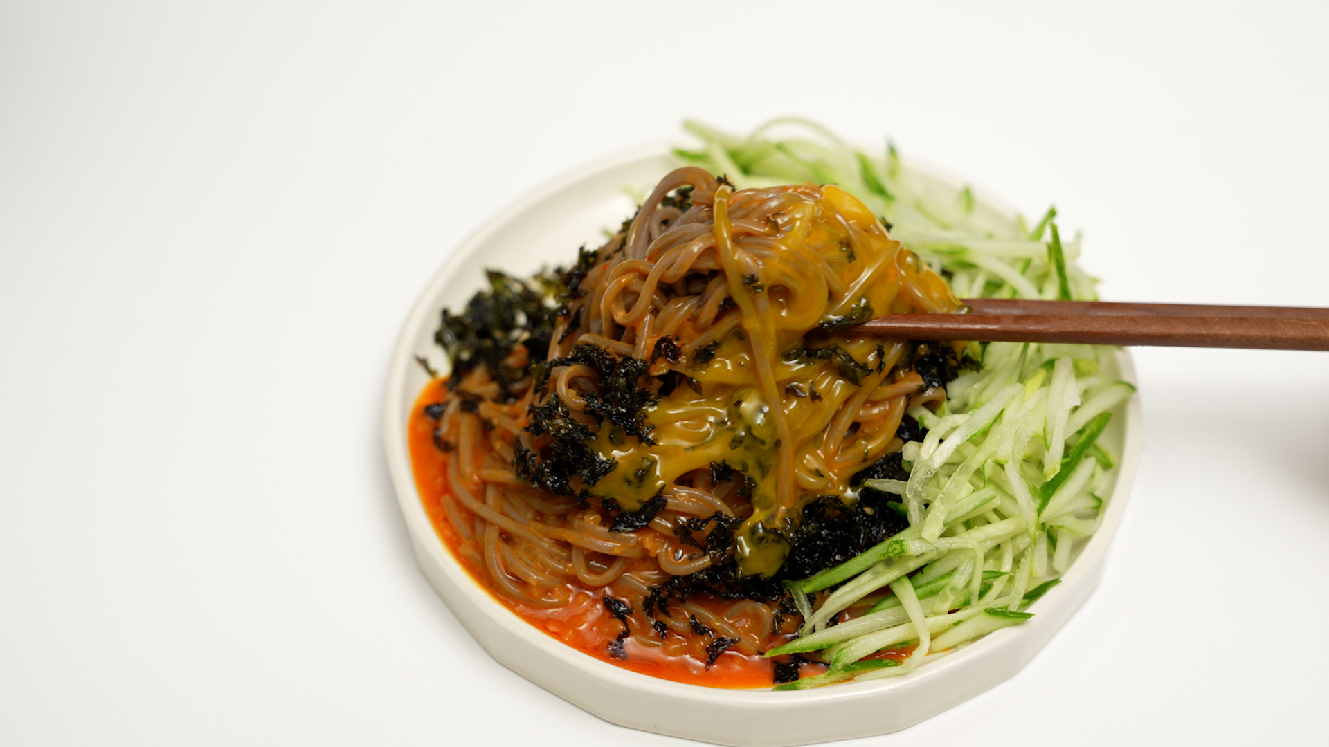 물기를 쫙 뺀 메밀면을 접시에 옮기고