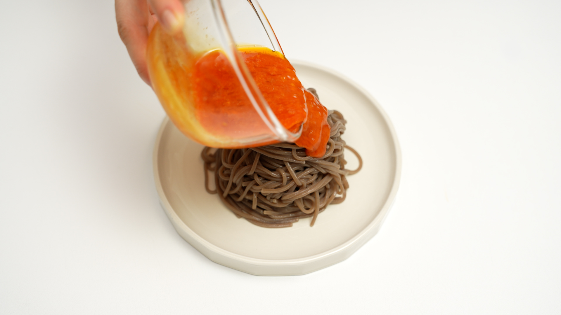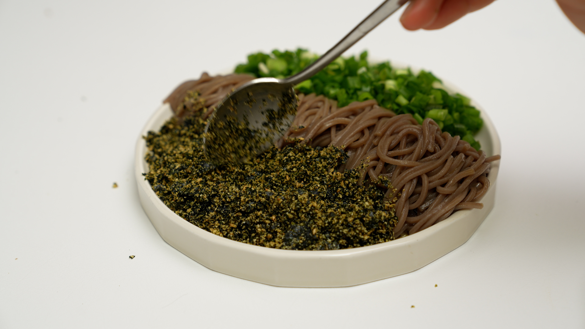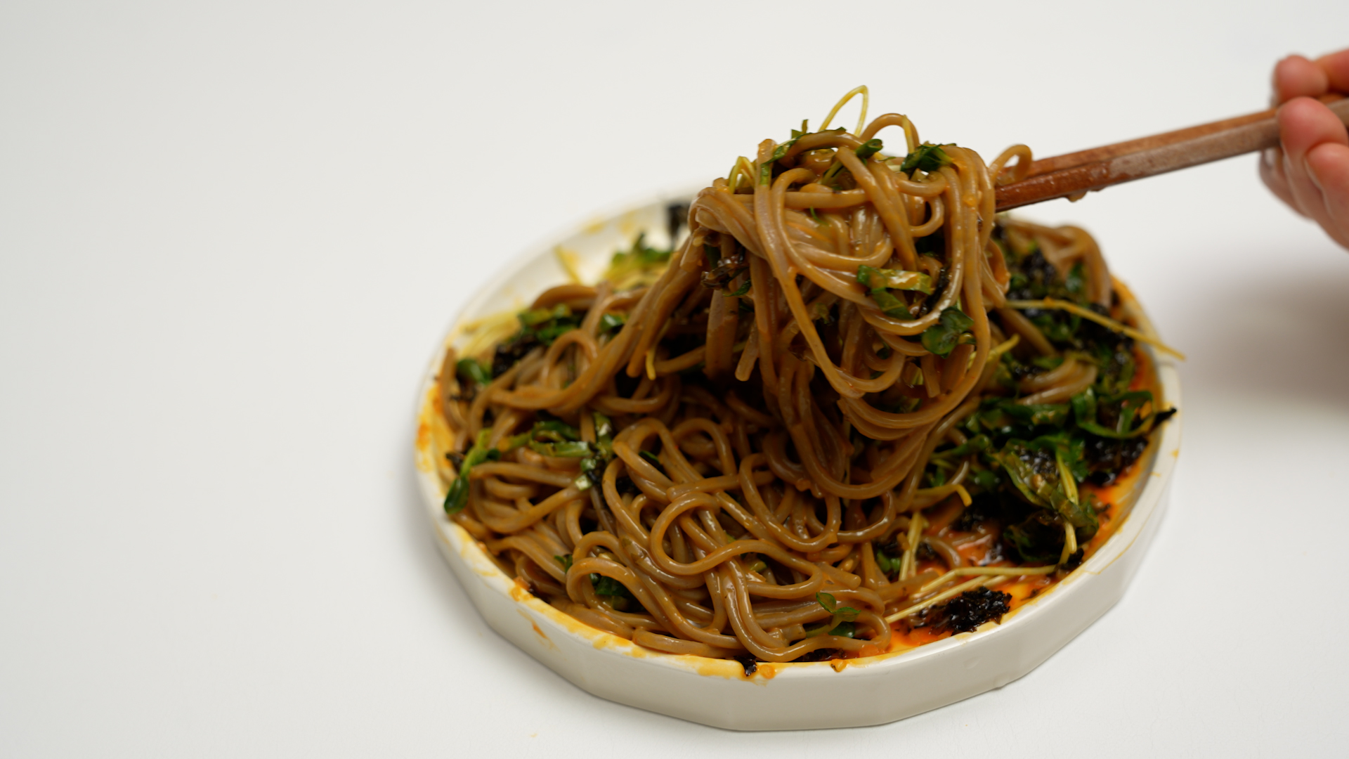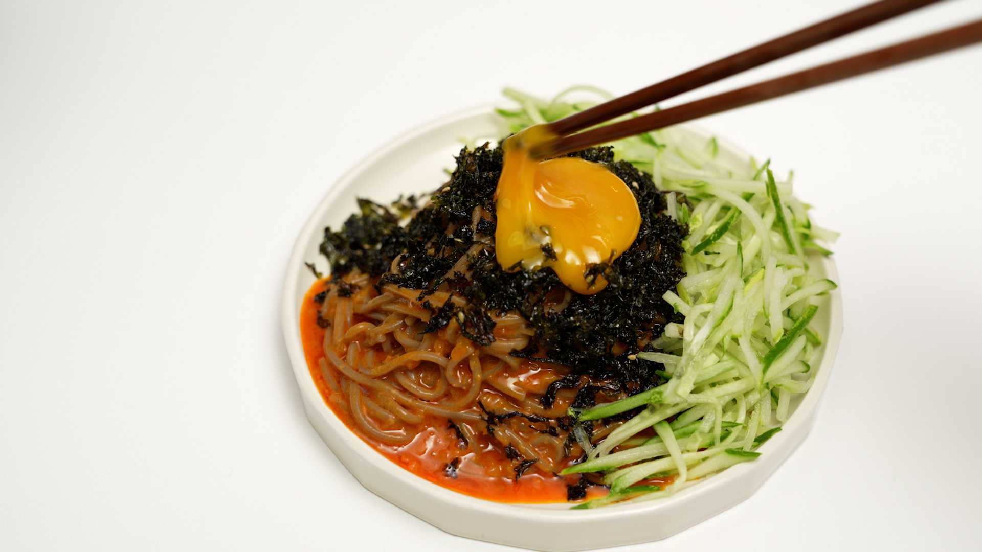 물기를 쫙 뺀 메밀면을 접시에 옮기고