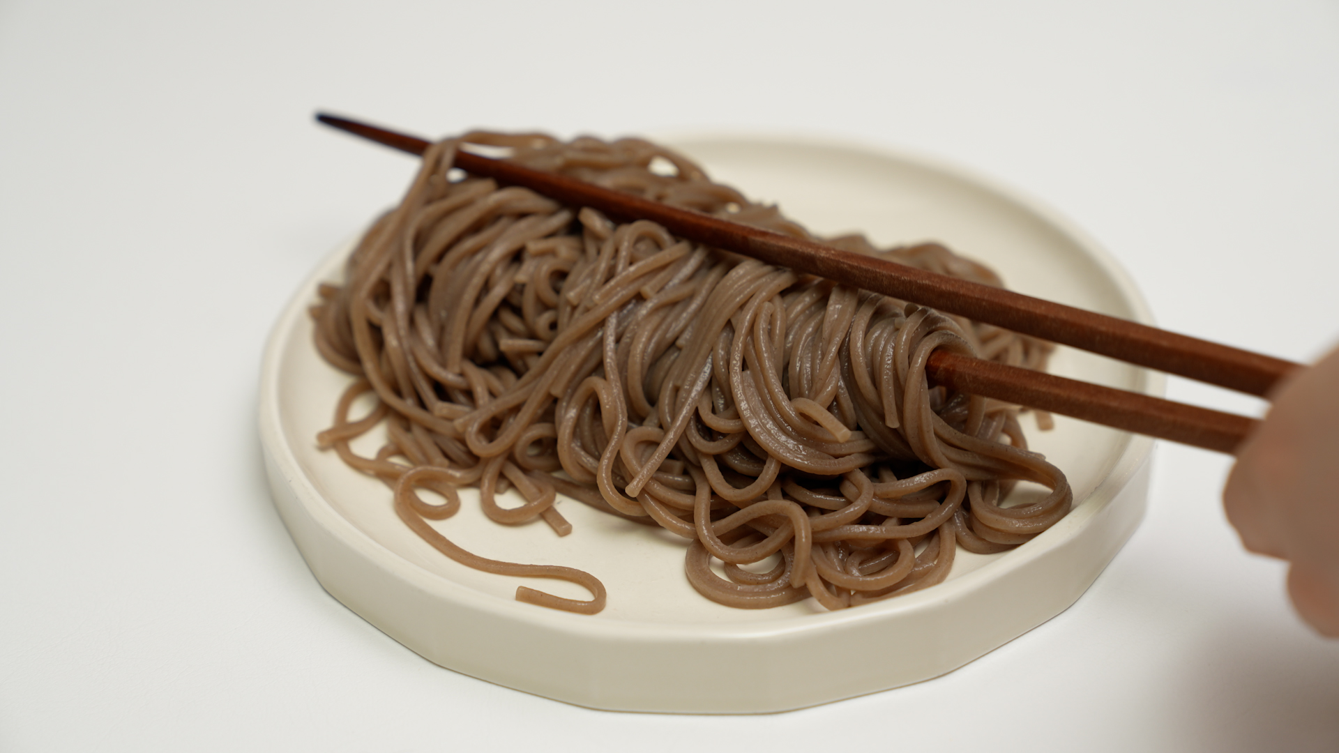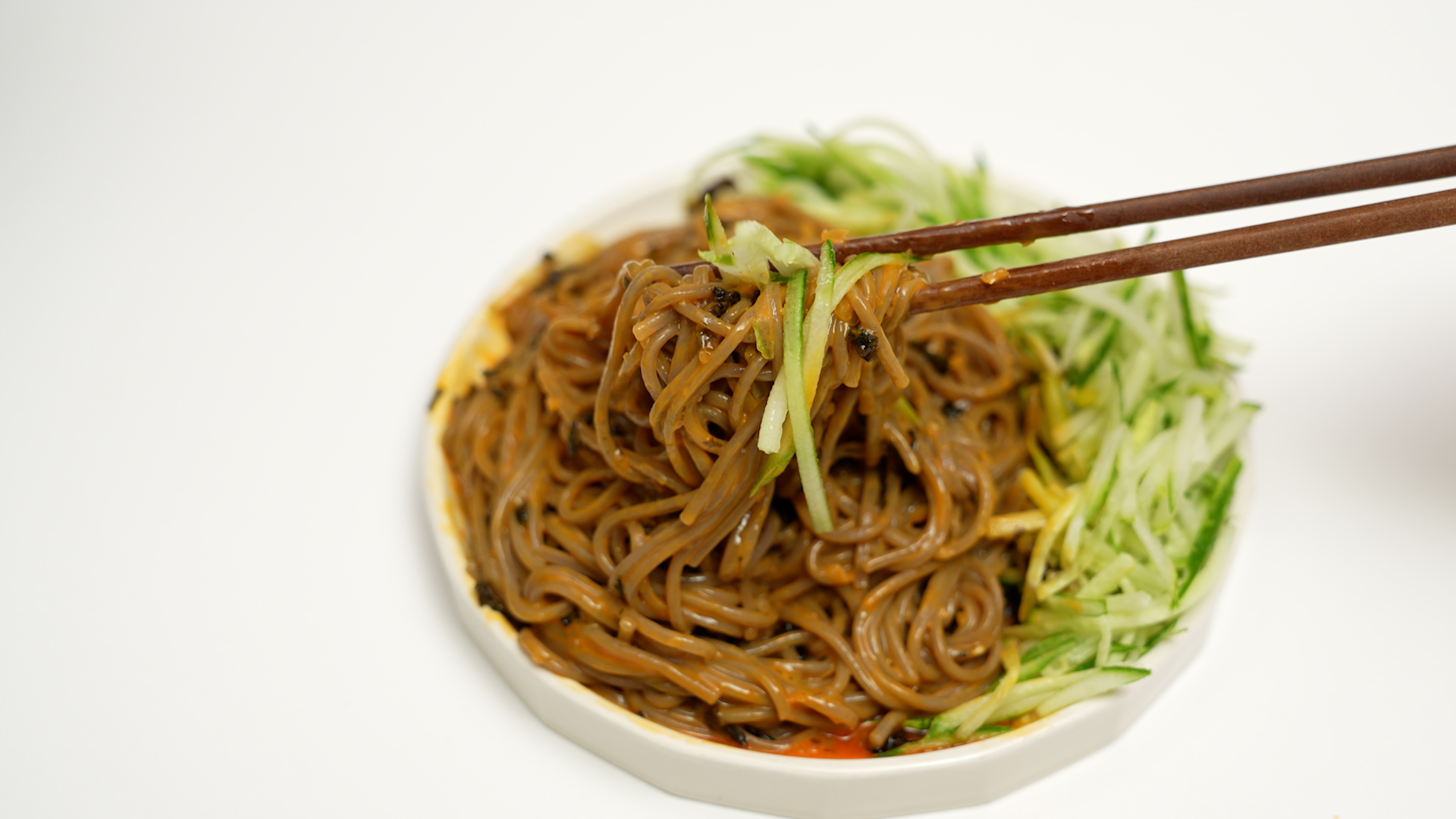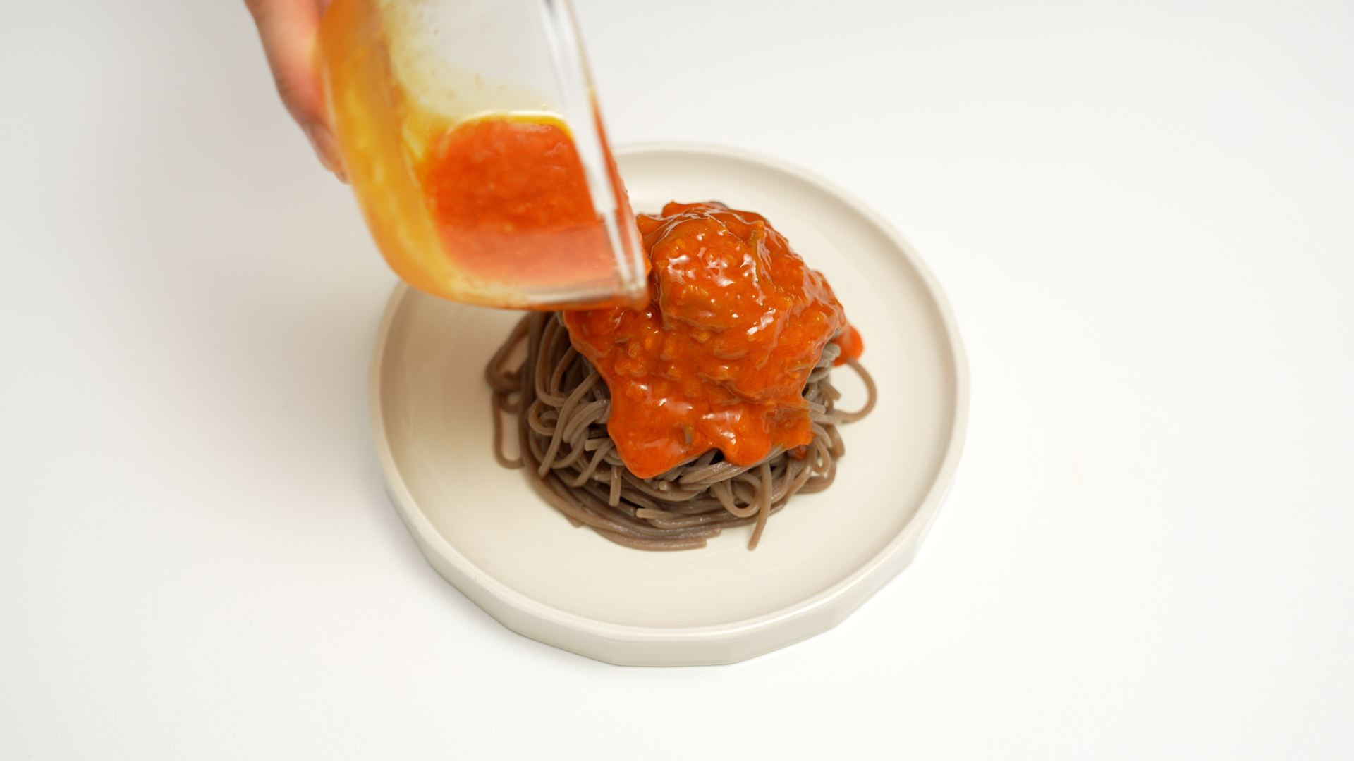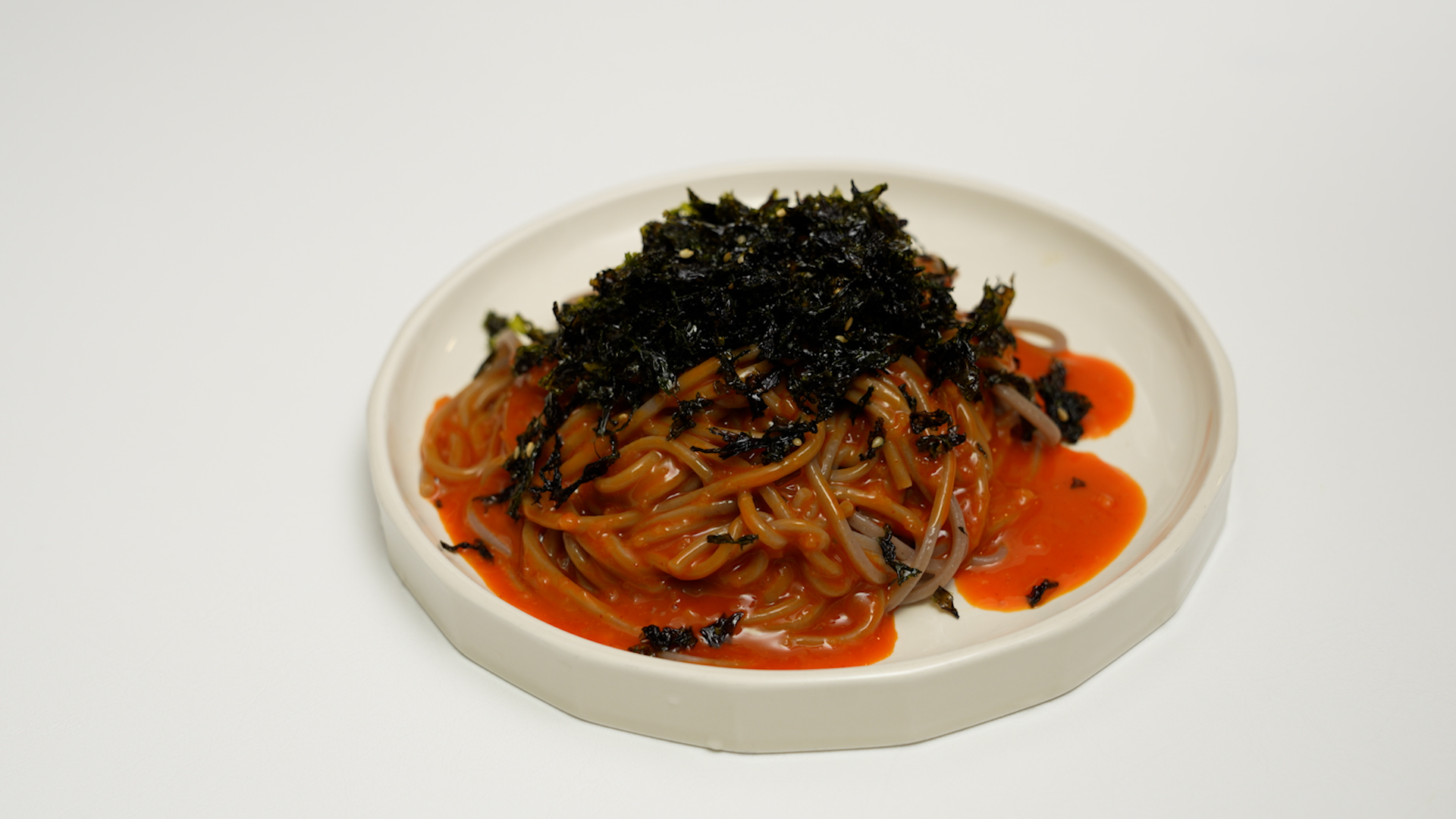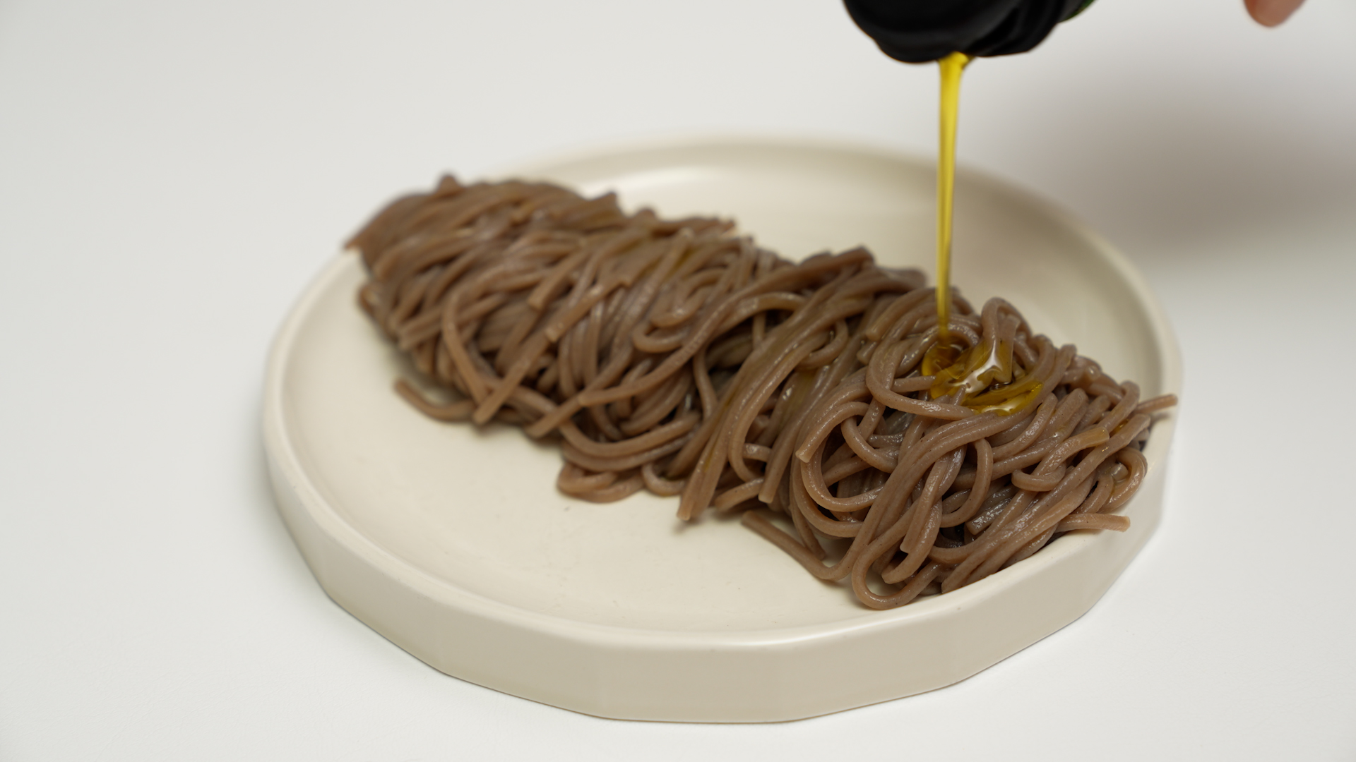 물기를 쫙 뺀 메밀면을 접시에 옮기고