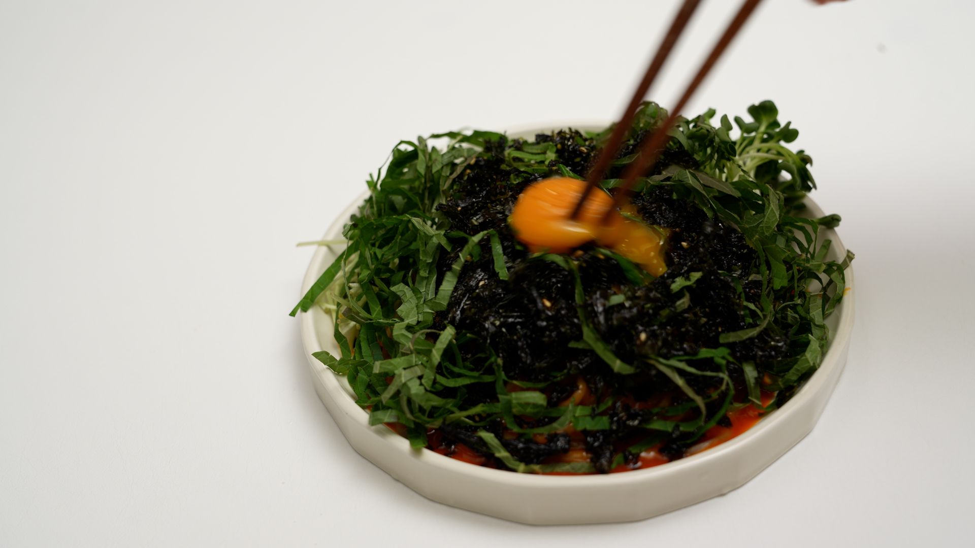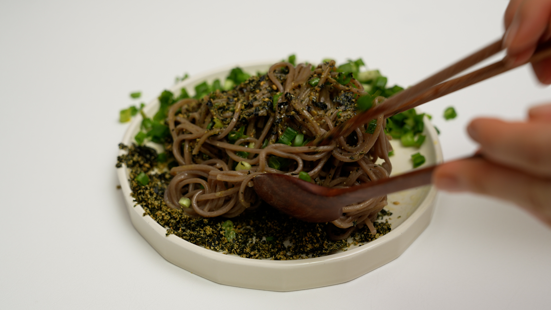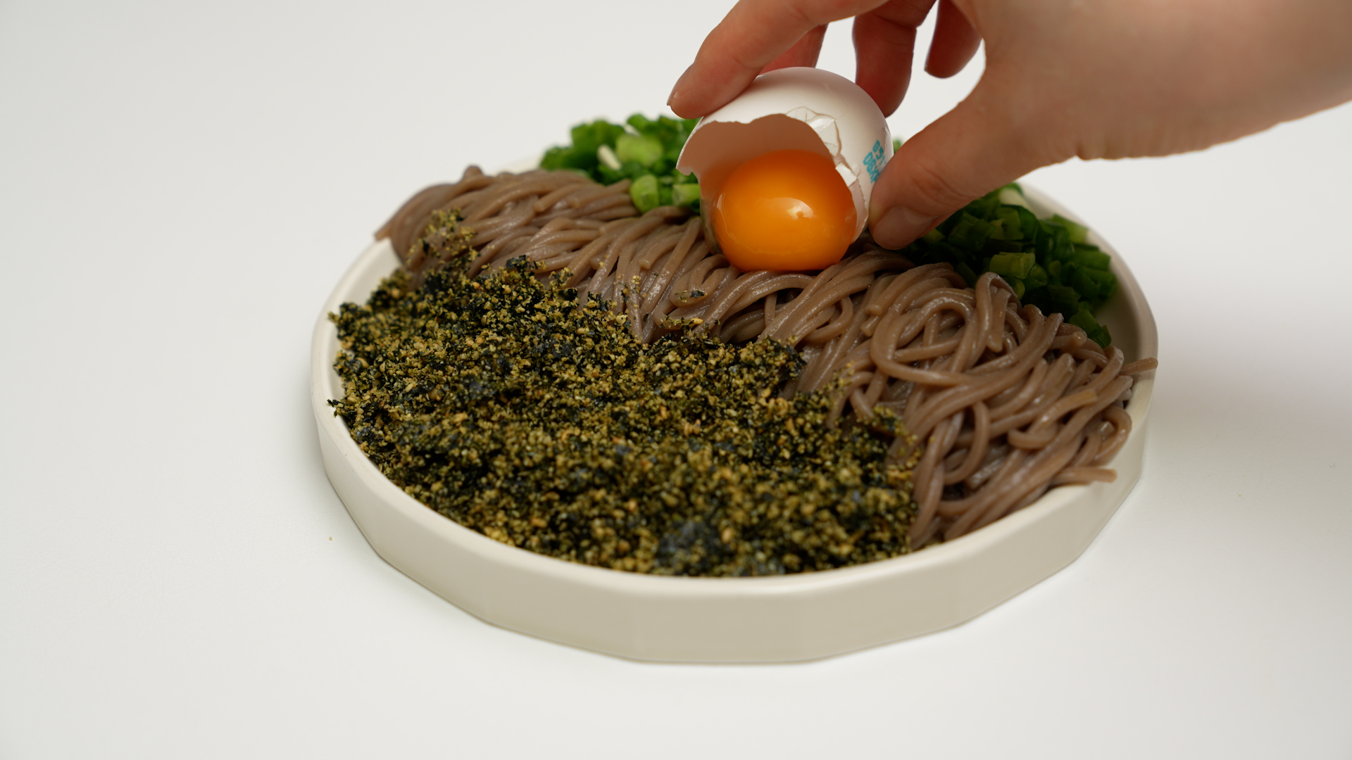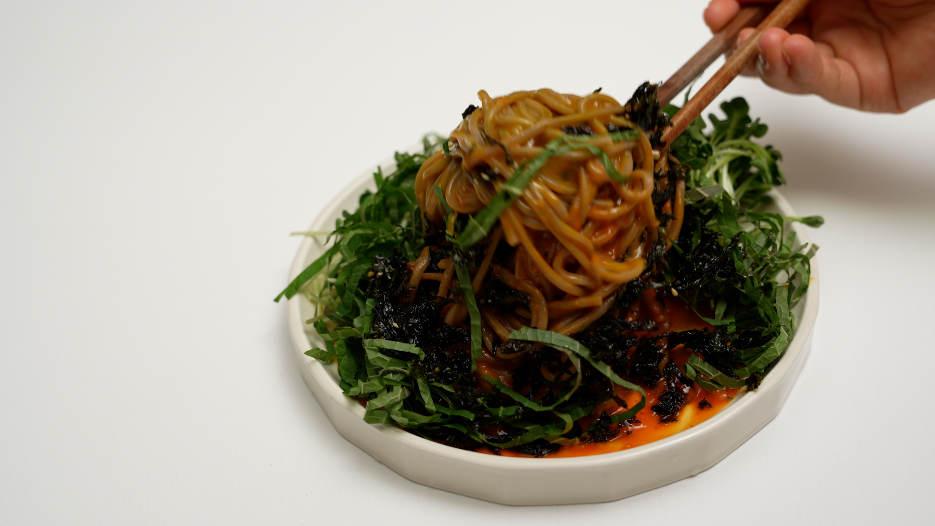 물기를 쫙 뺀 메밀면을 접시에 옮기고