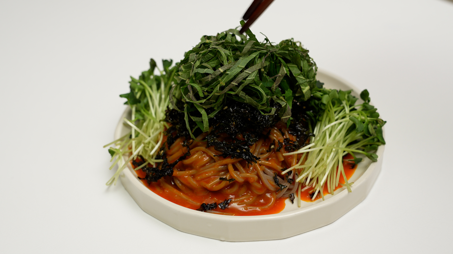 고소하고 매운 불마요 소스와 짭짤한 김자반에 깻잎과 무순이 어우러져 정말 맛있는 막국수!