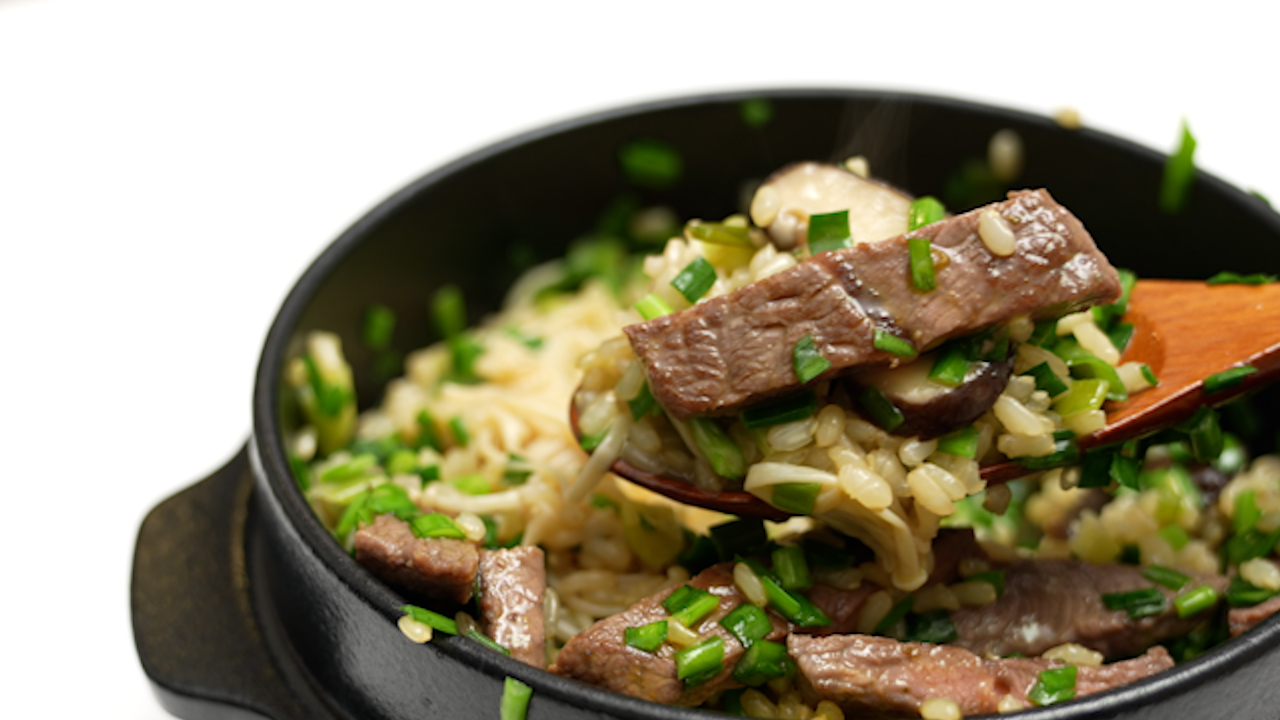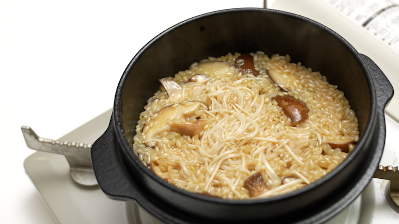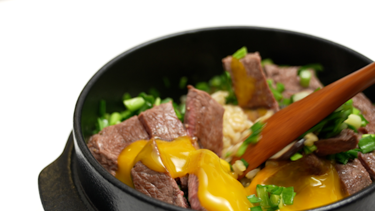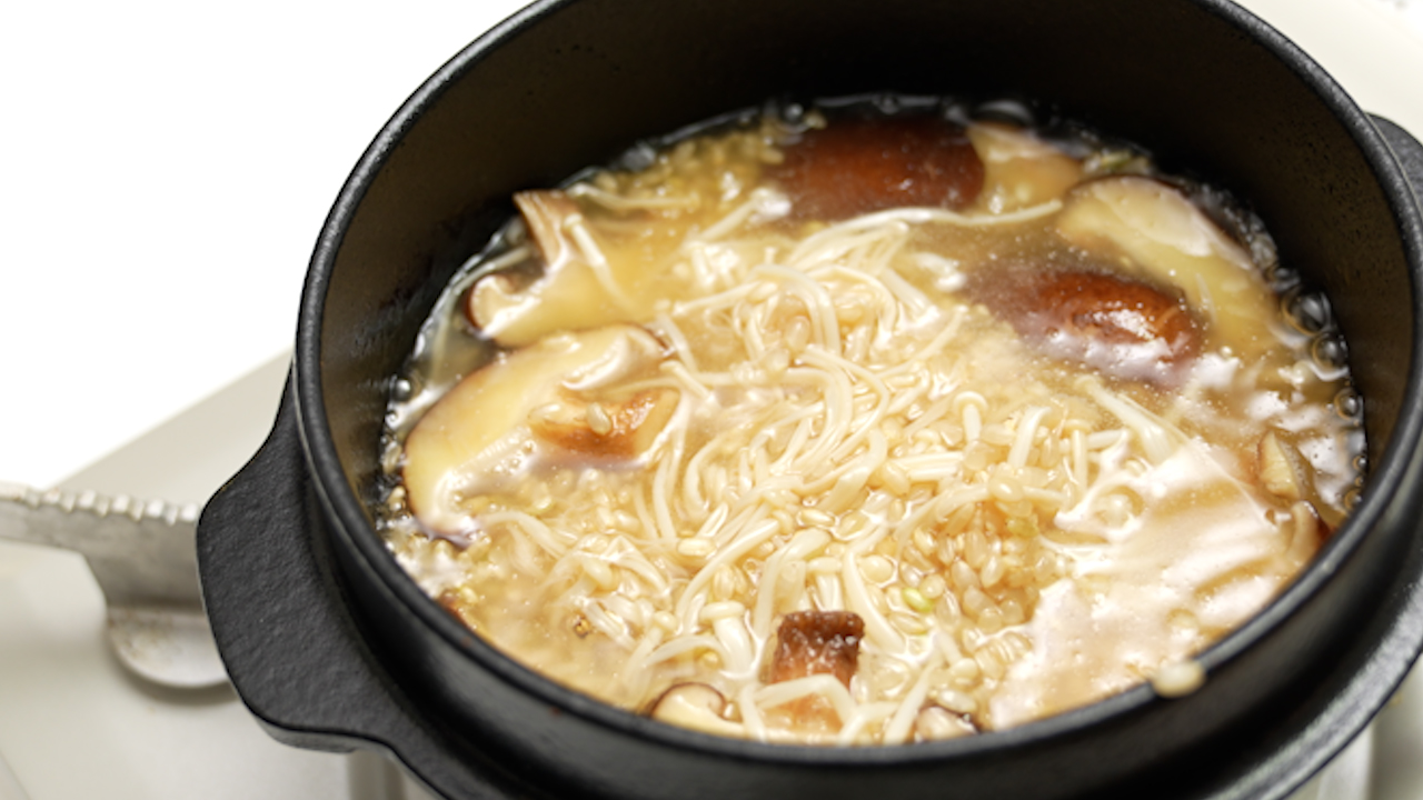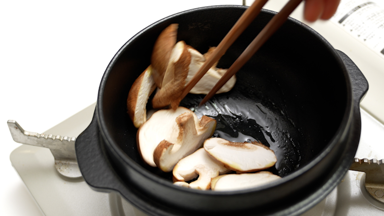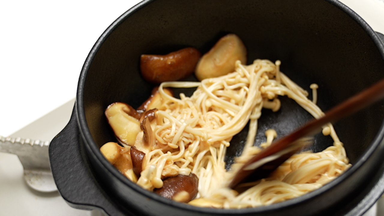 계란 노른자를 올리면 맛있는 부채살 버섯 솥밥 완성!