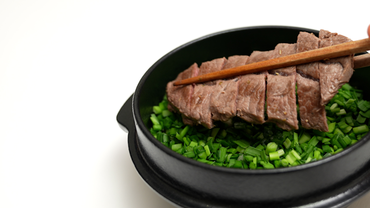 재워둔 부채살을 강불에 달군 팬에 앞뒤로 1분씩 구워주세요.