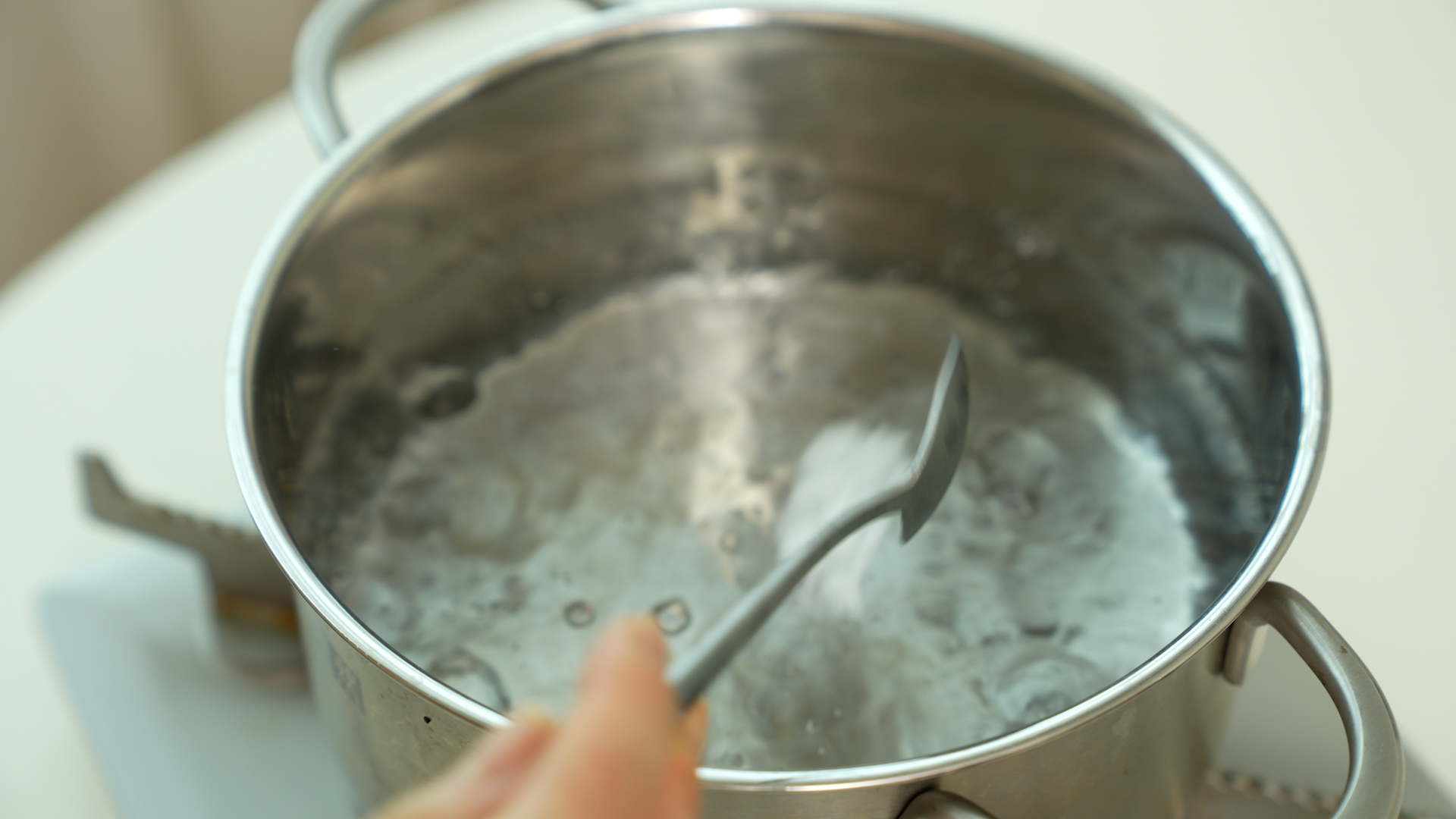 냄비에 1.5L 정도 물을 넣고, 물이 끓으면 소금 1스푼을 넣어주세요.