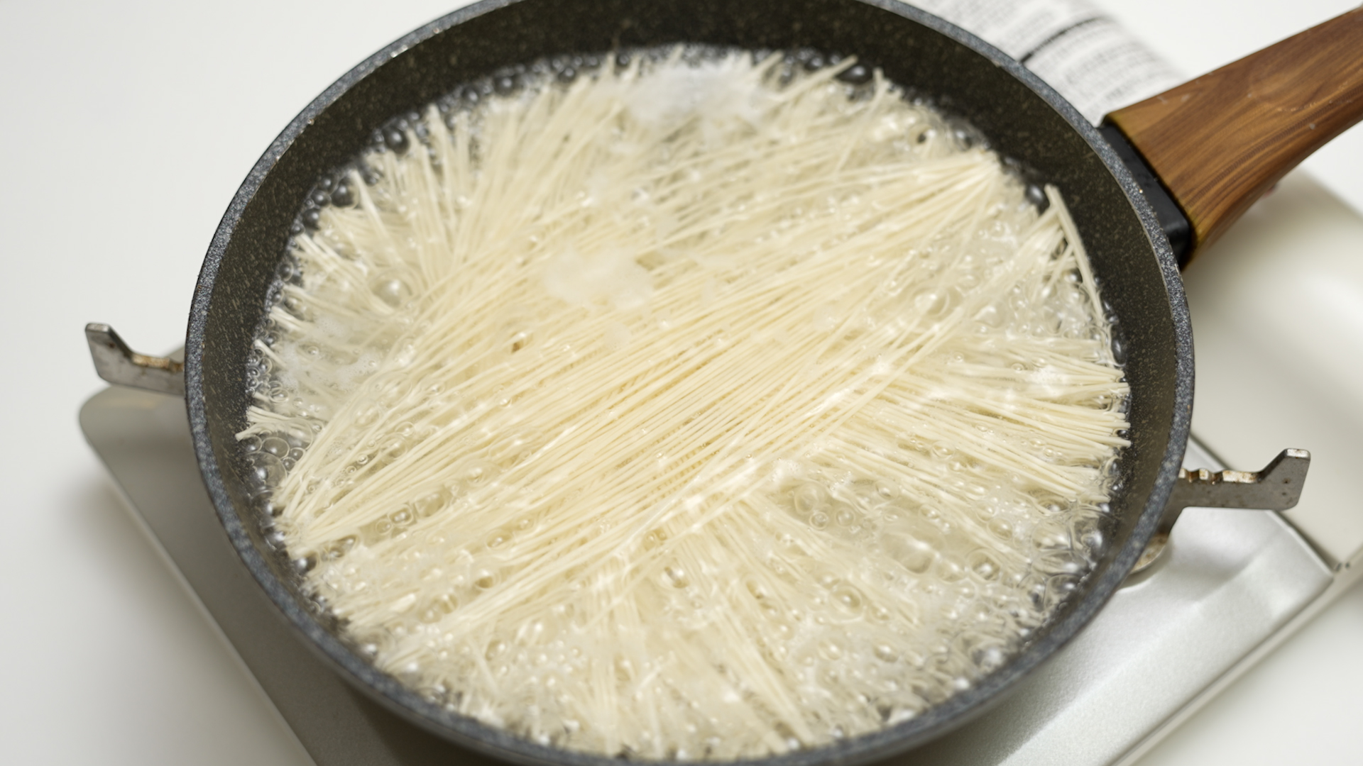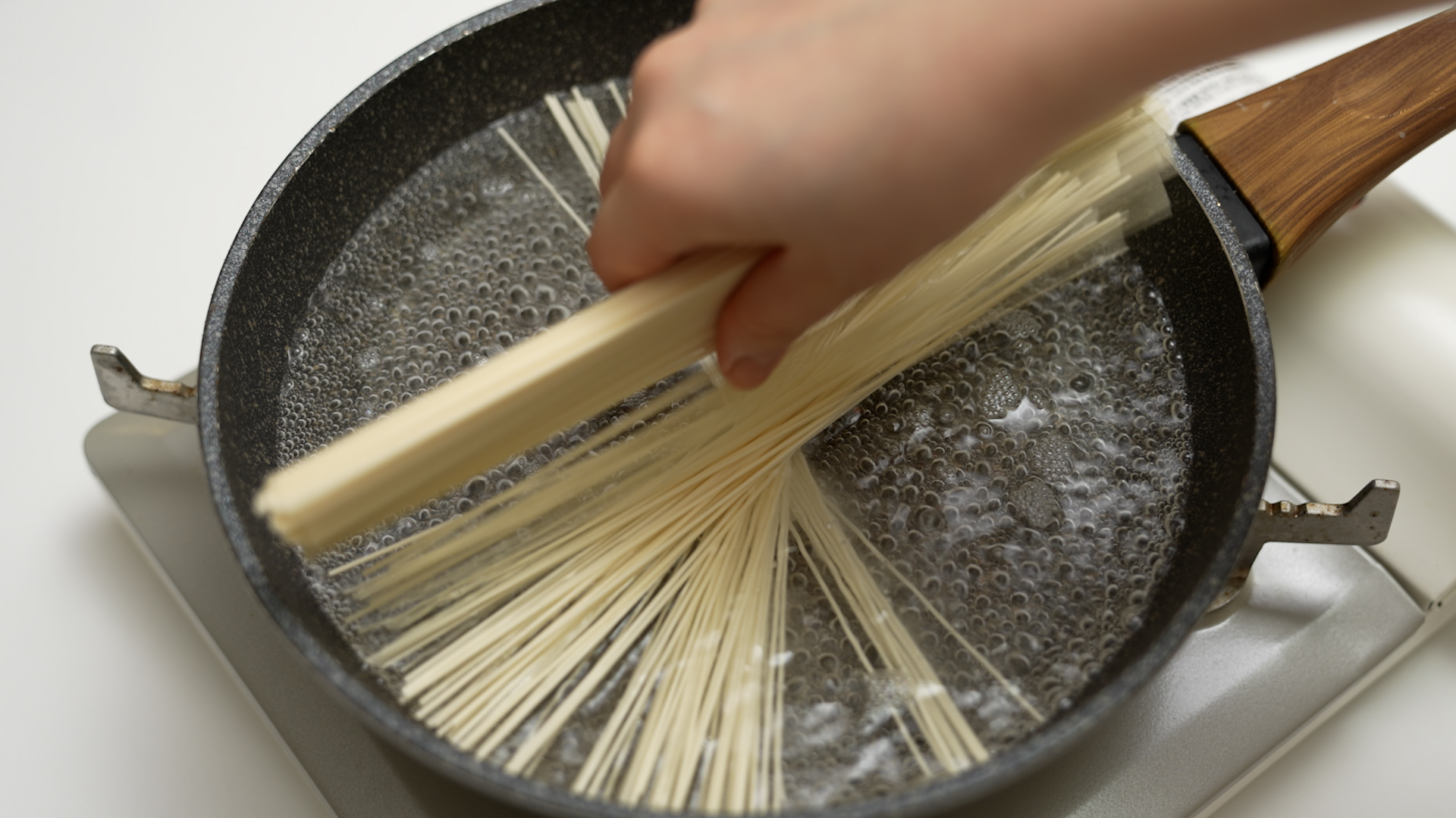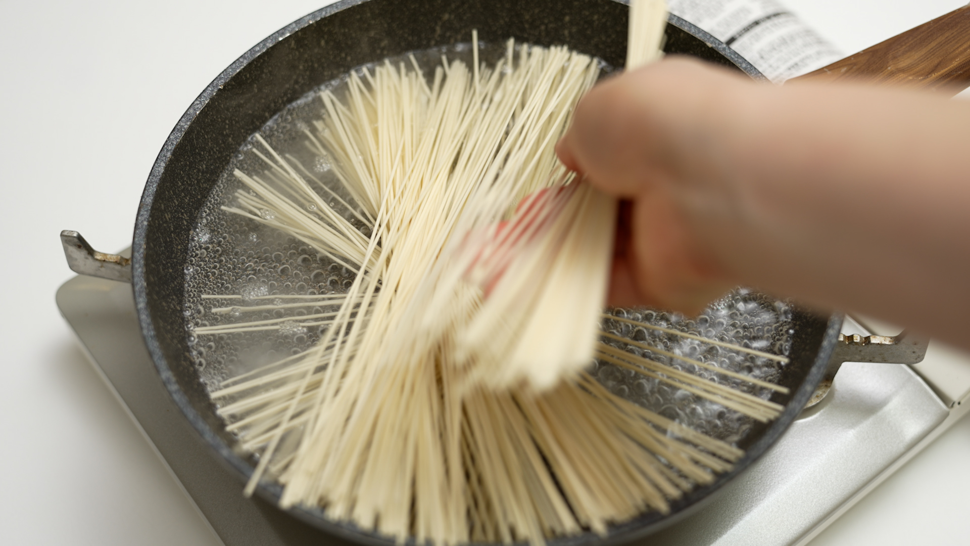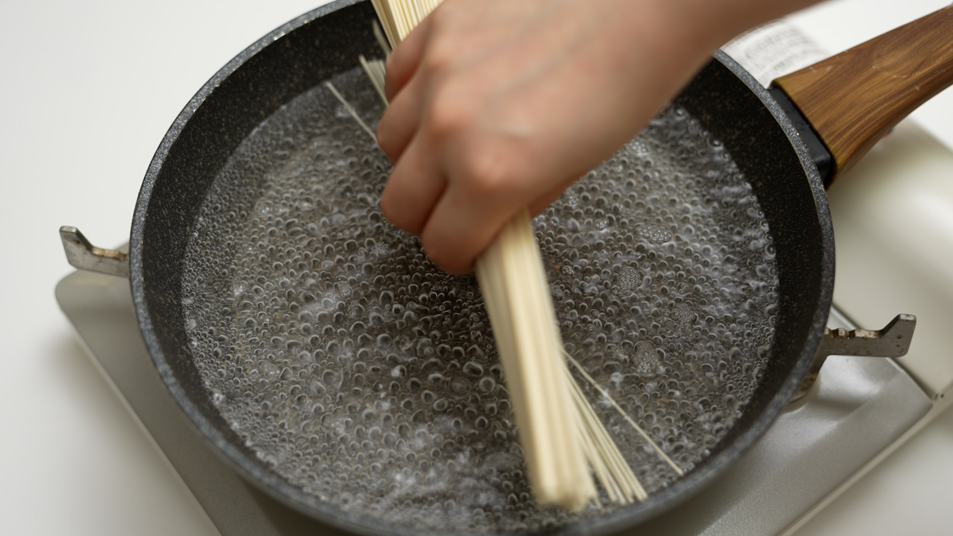 팬에 소면을 삶으면 물이 넘치지 않고, 쉽게 삶을 수 있어요