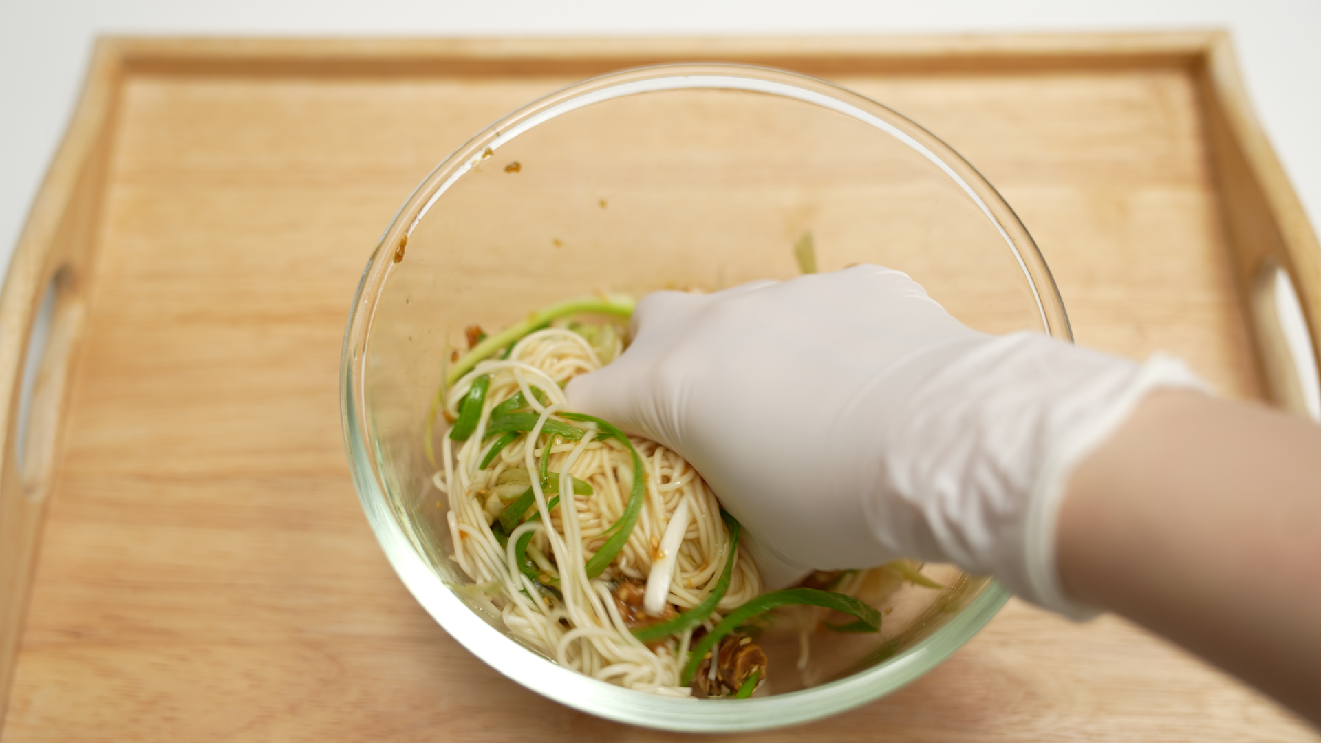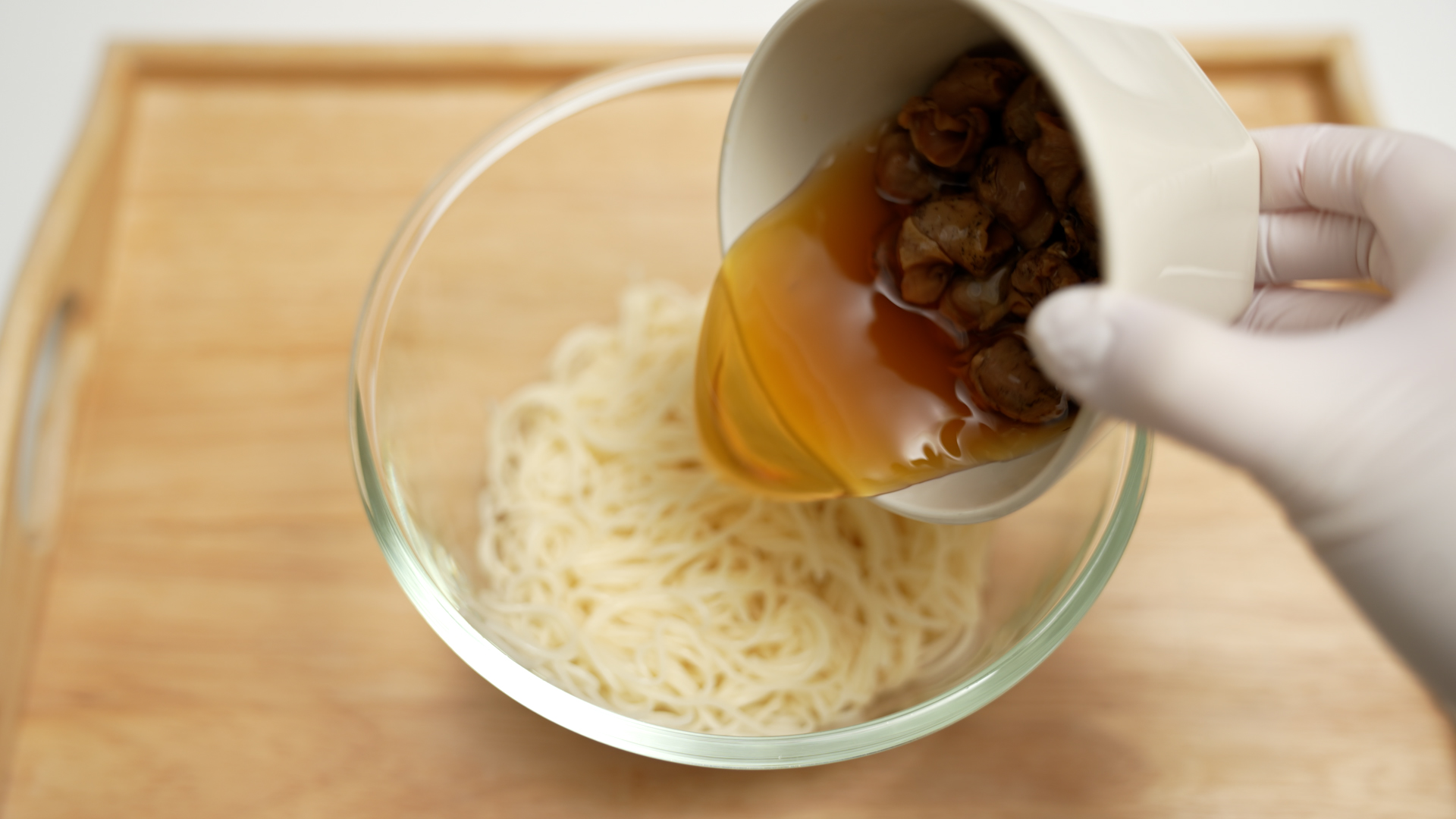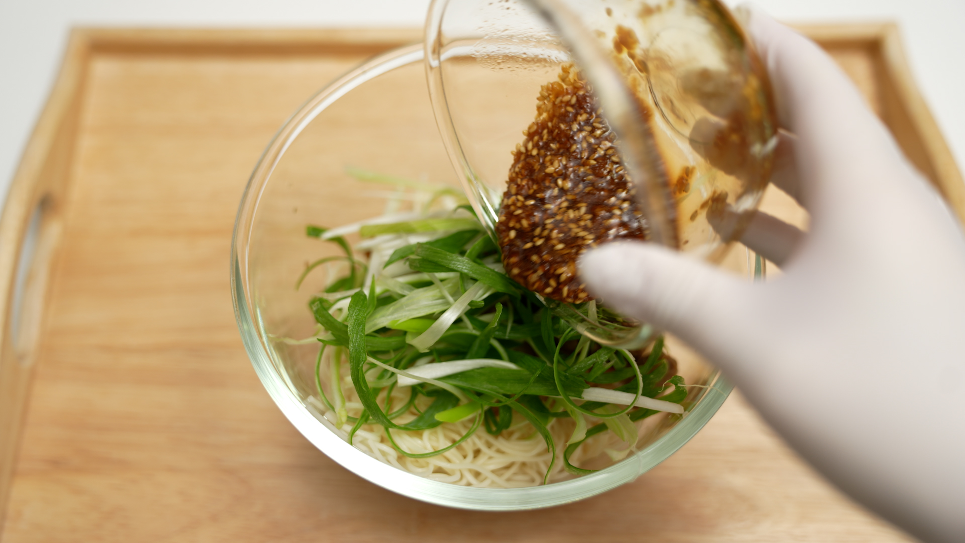 제품 조리법대로 소면을 삶은 뒤, 찬물로 헹궈주세요.