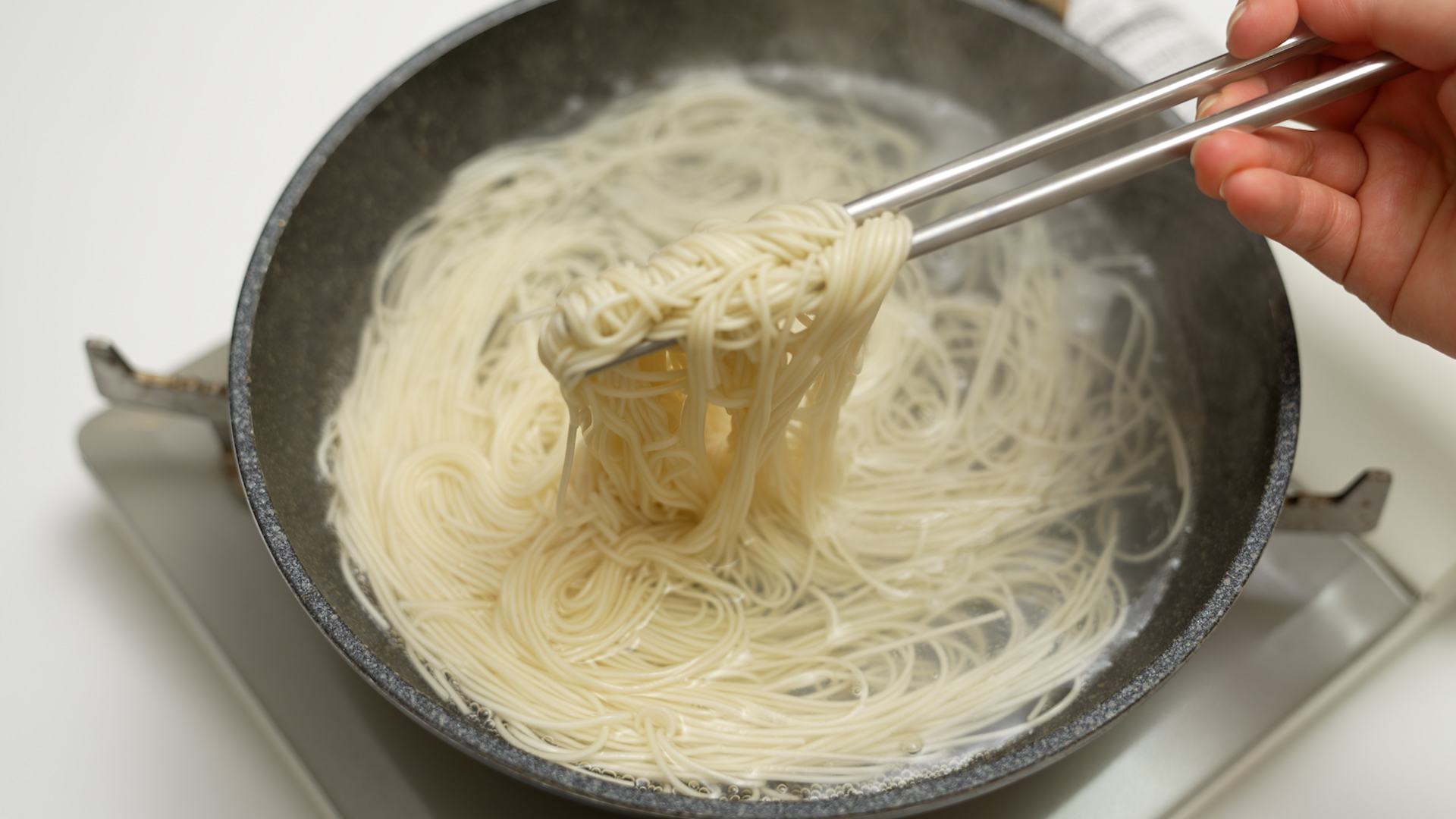 팬에 소면을 삶으면, 절대 넘치지 않아요