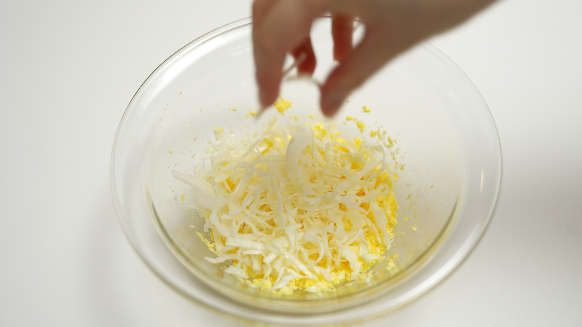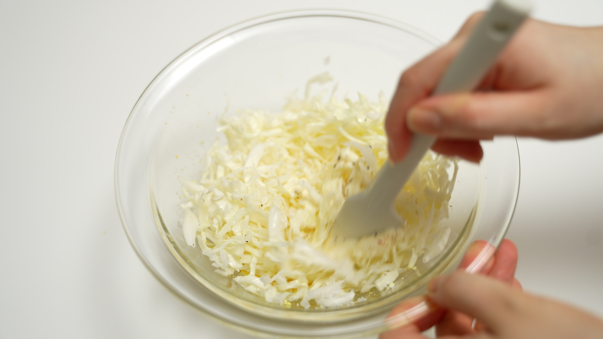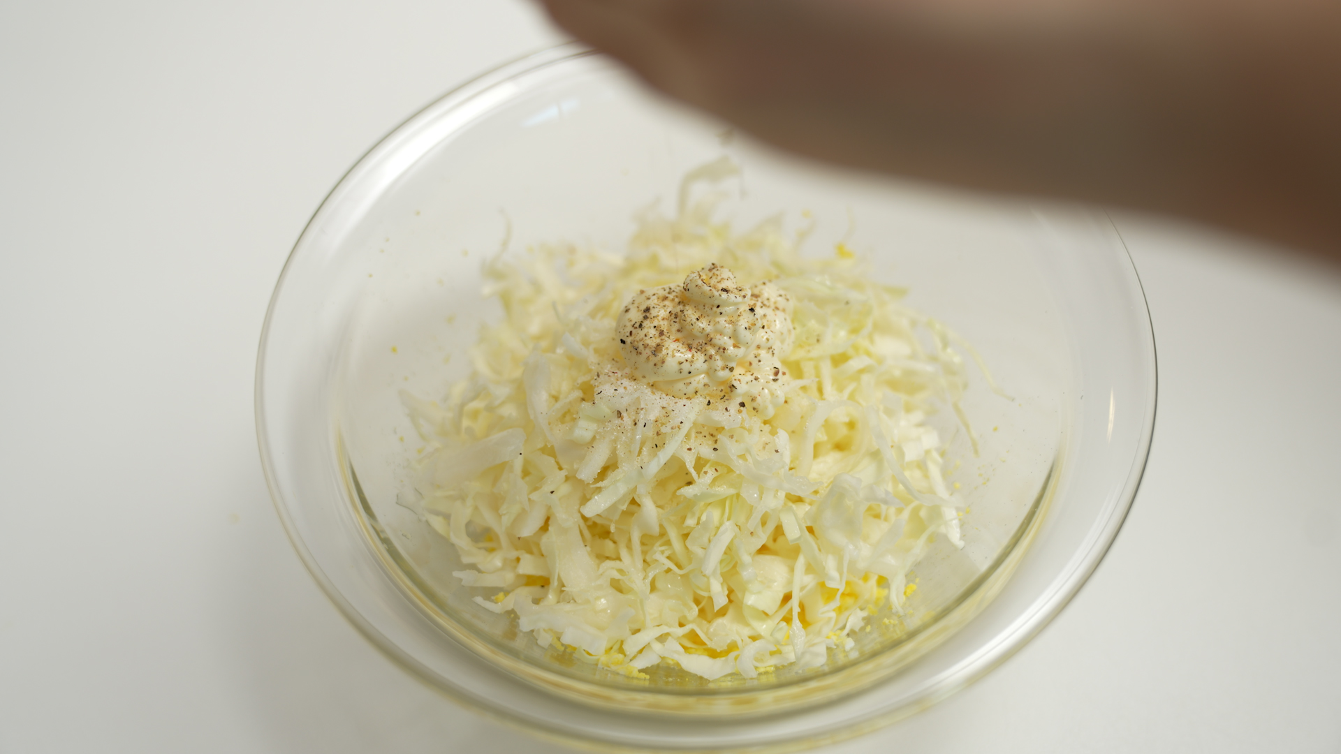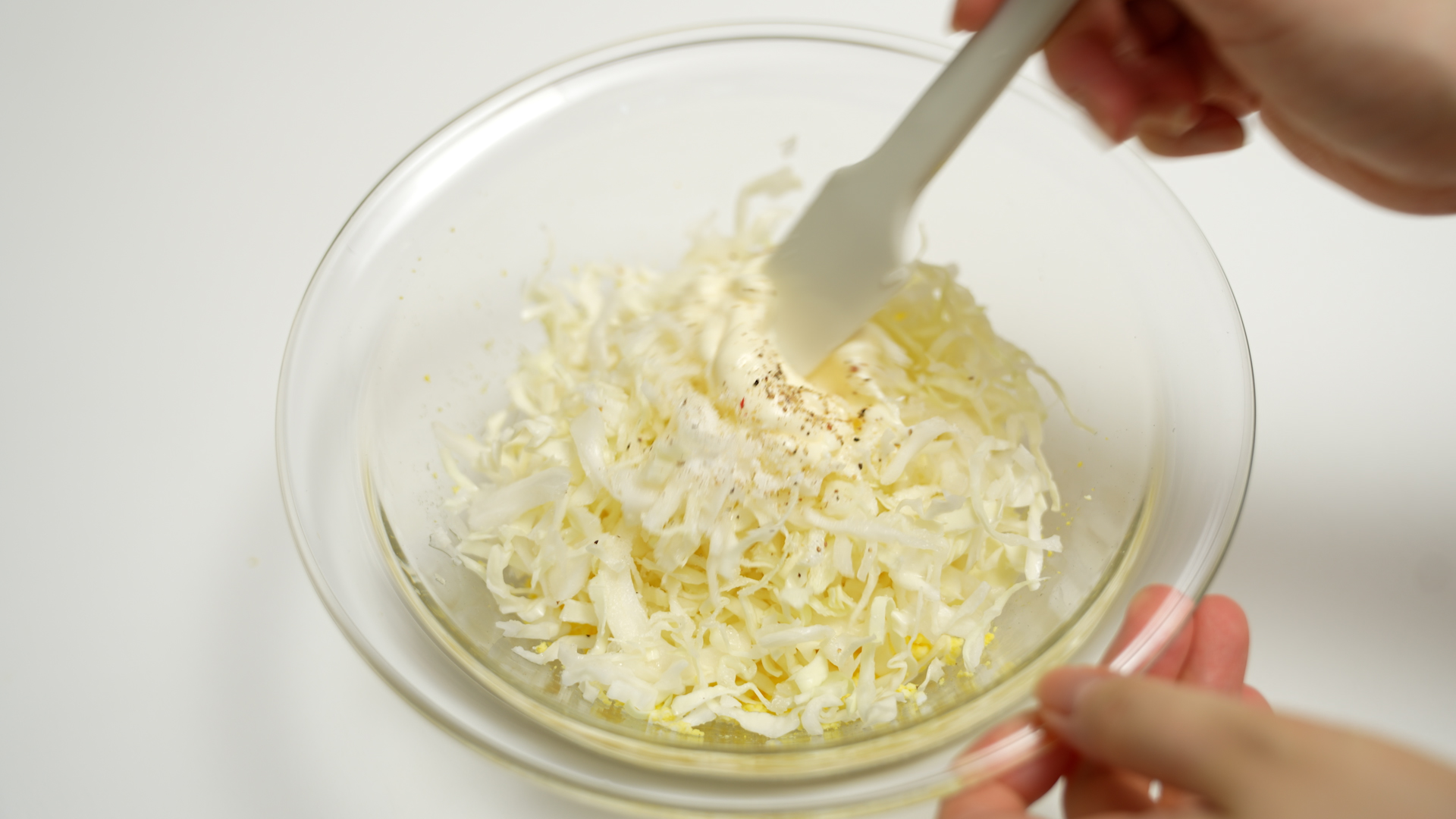 으깬 계란에 채 썬 양배추 2~3줌을 넣고,