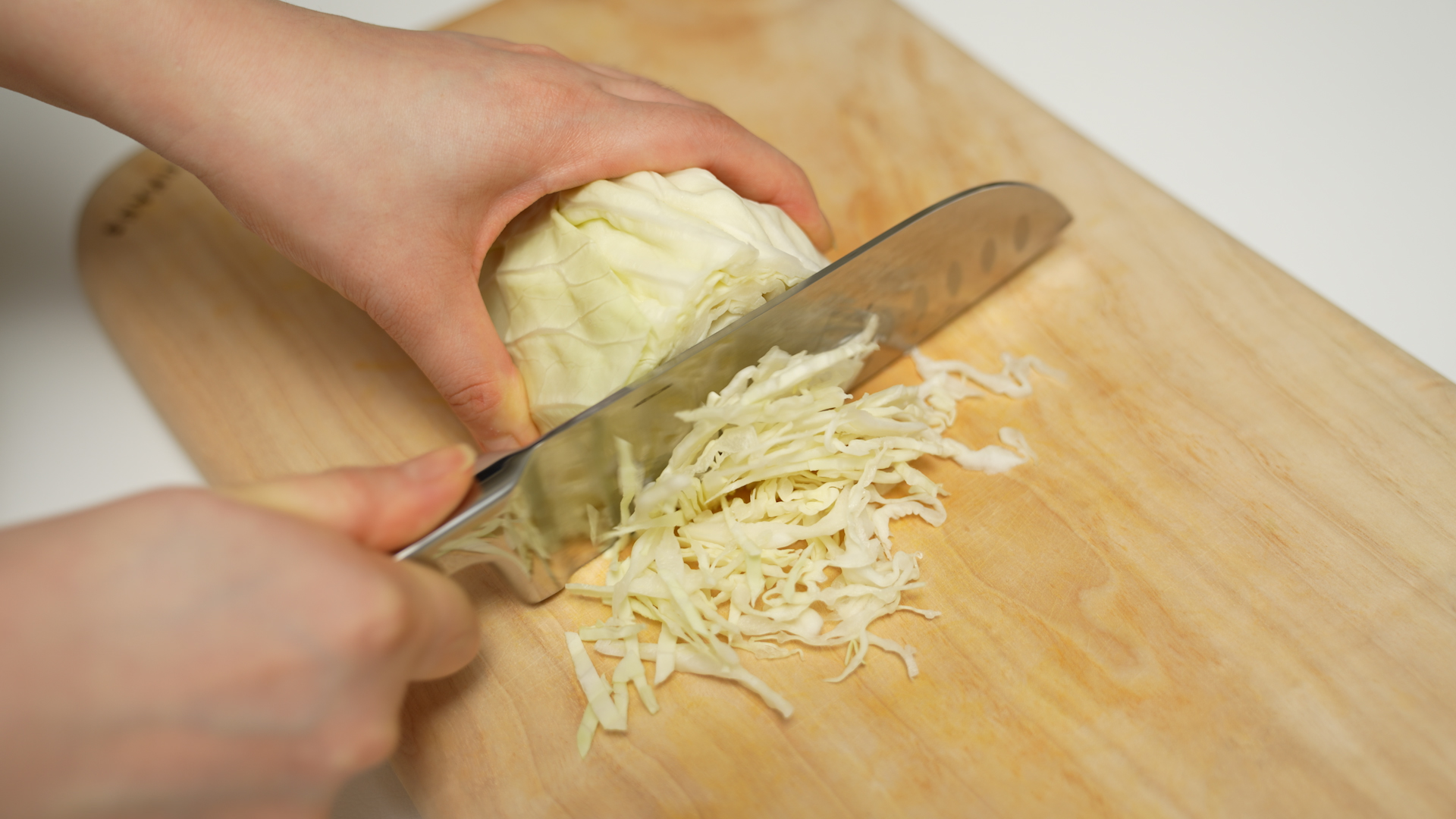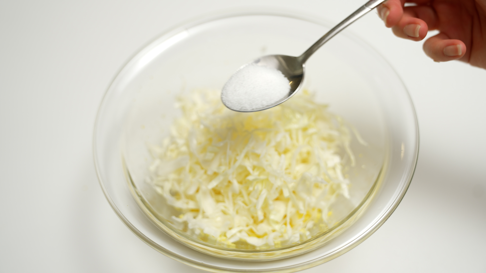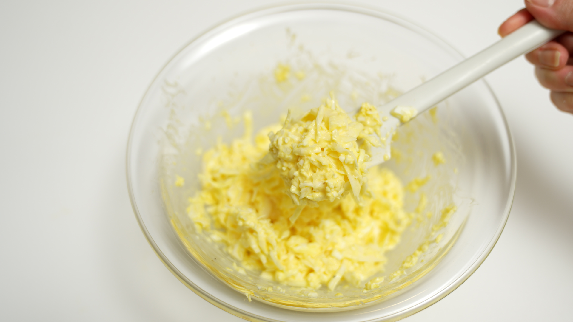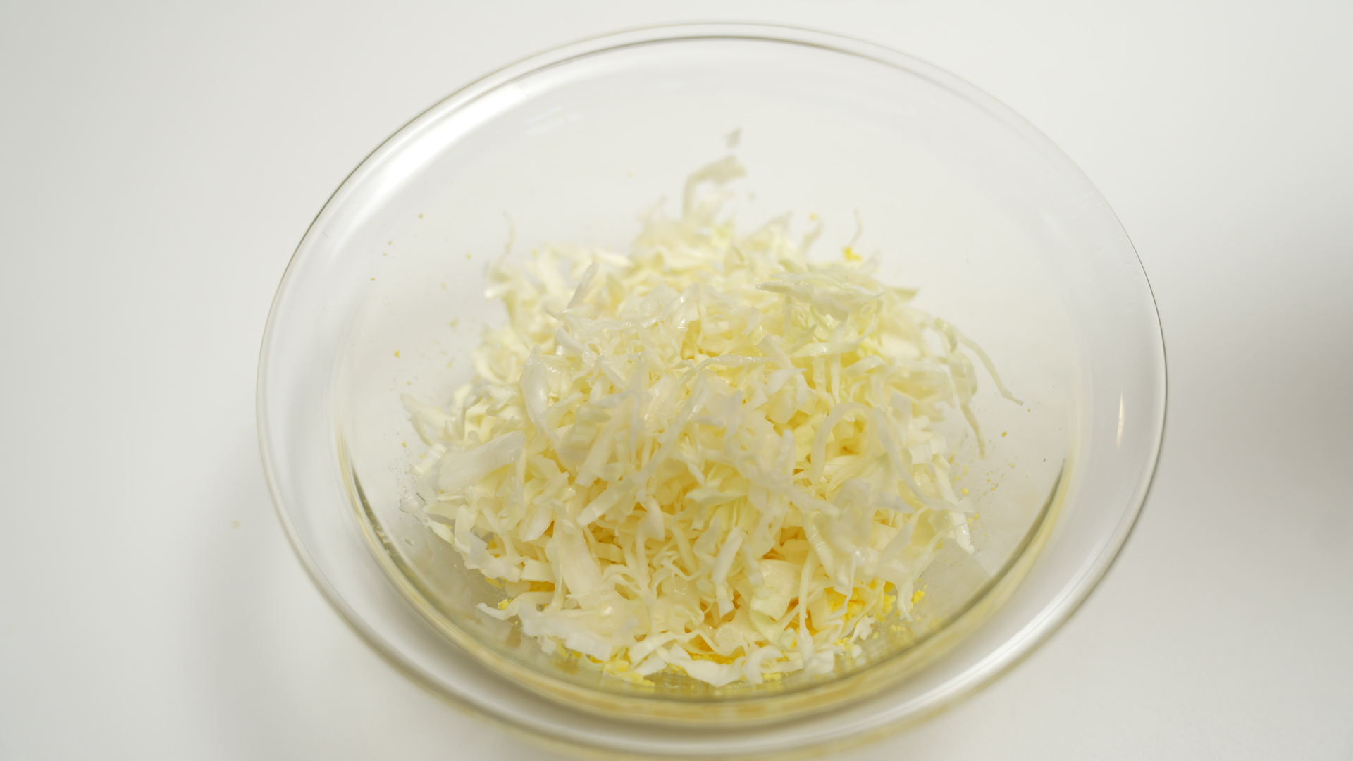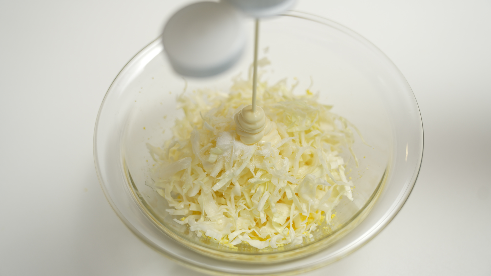으깬 계란에 채 썬 양배추 2~3줌을 넣고,