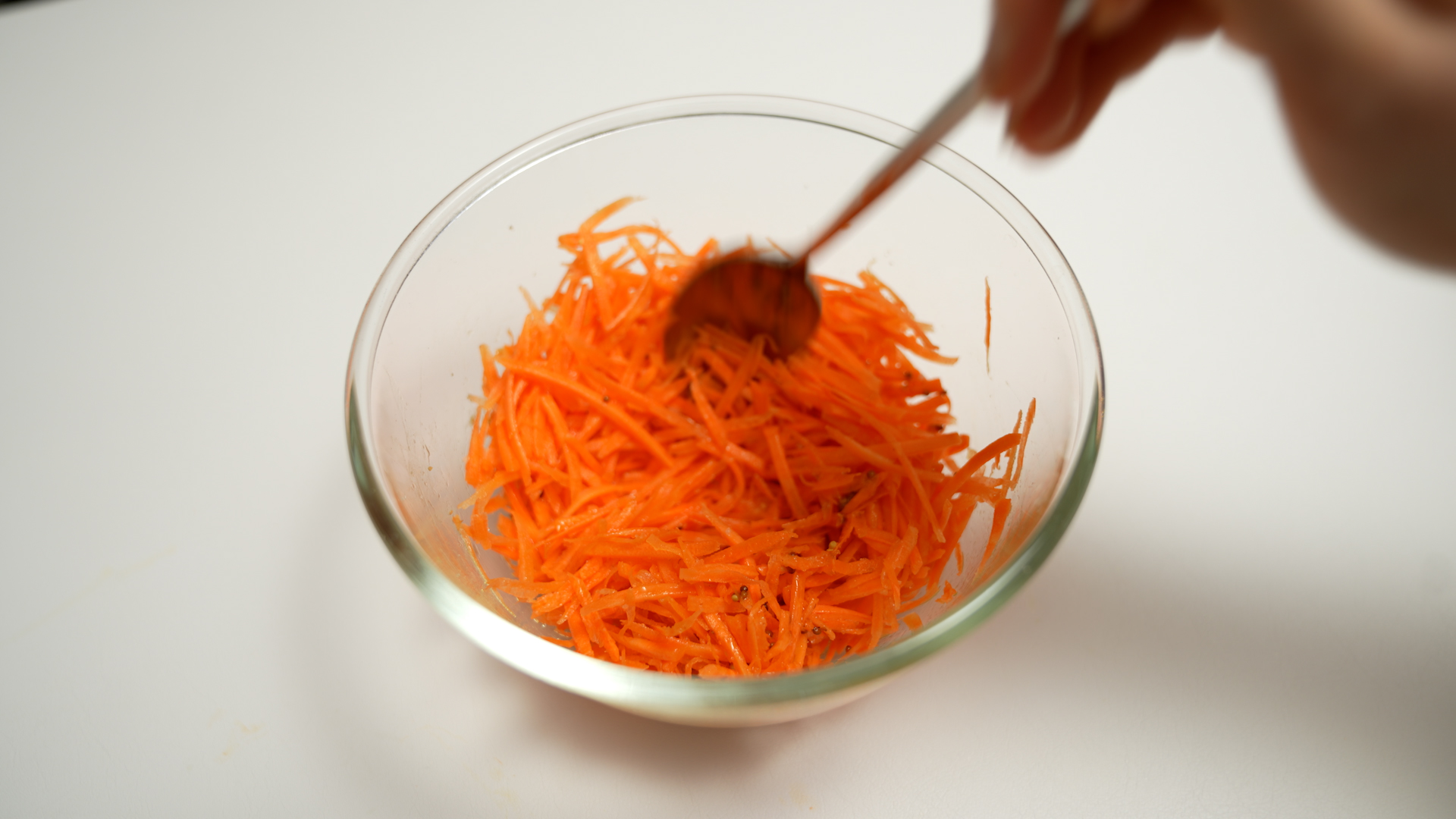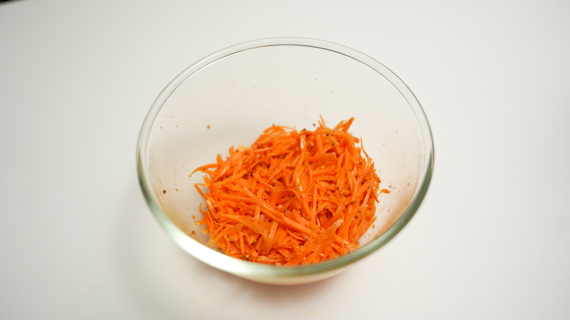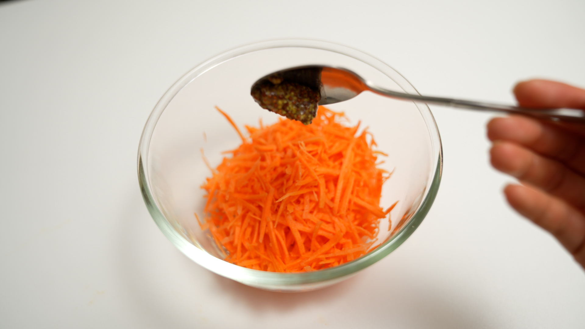 채 썬 당근을 볼에 넣고, 홀그레인 머스타드 0.5T