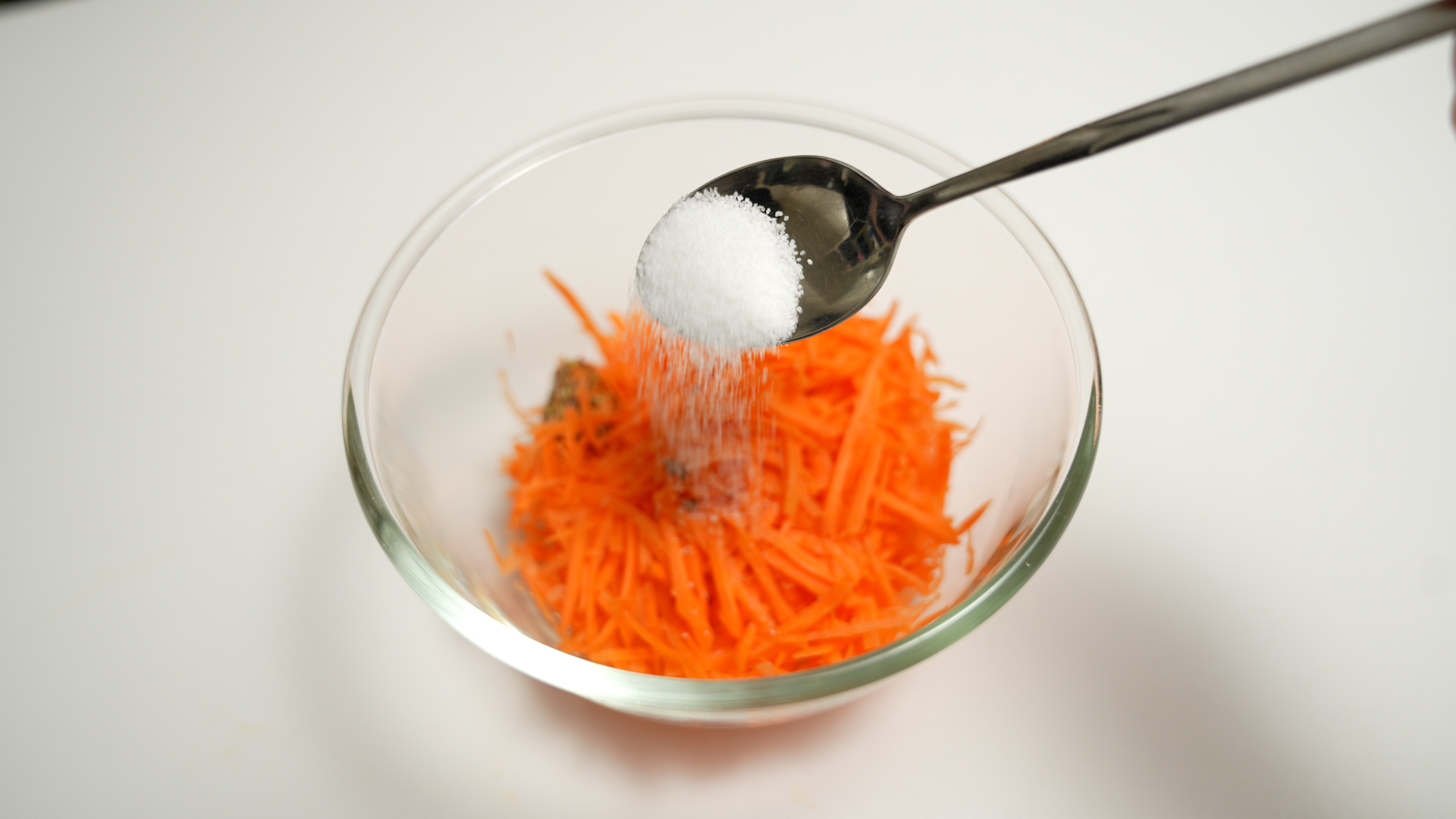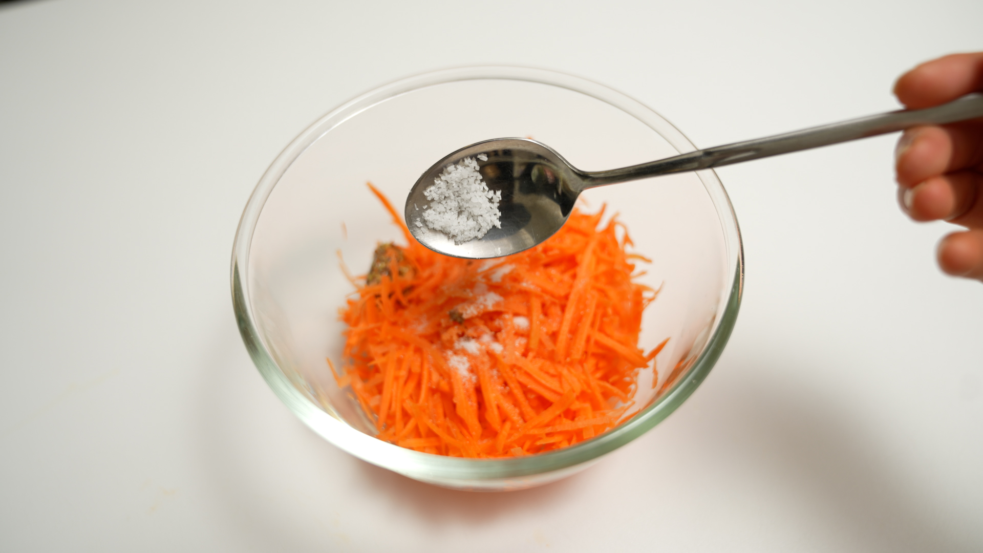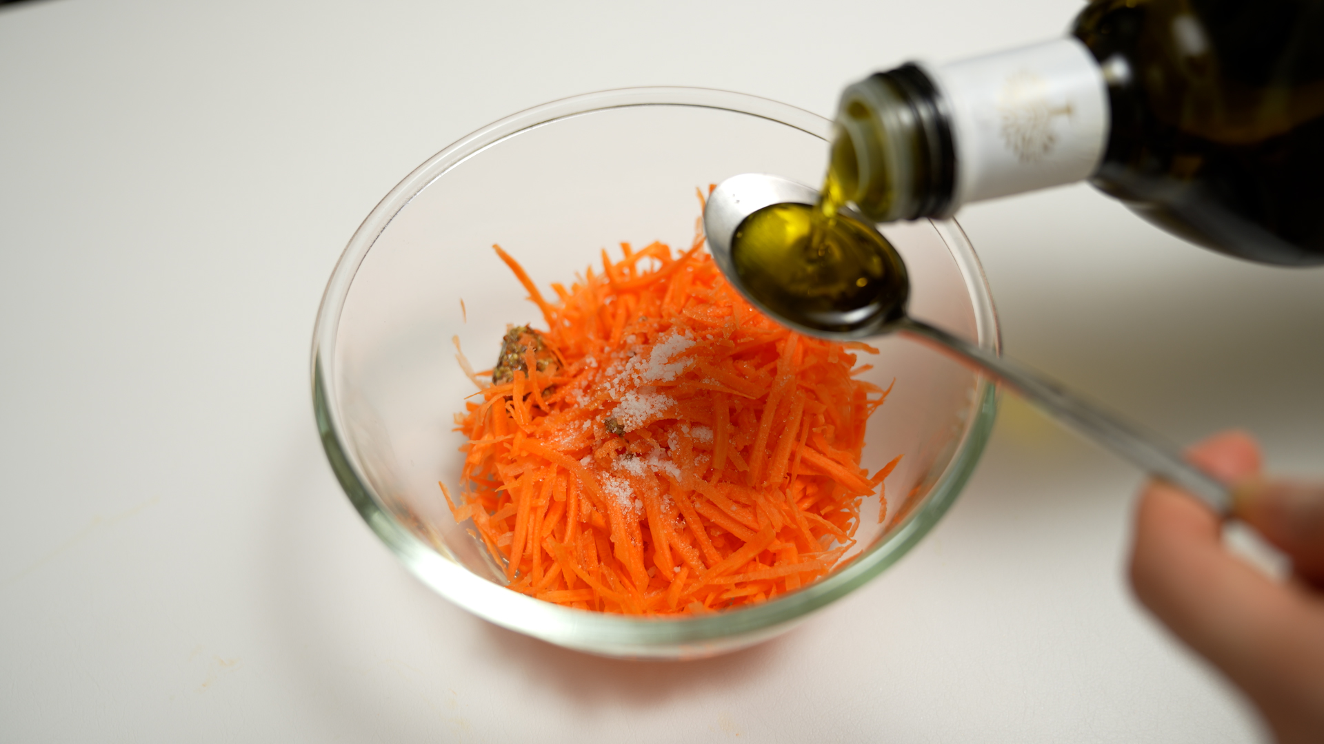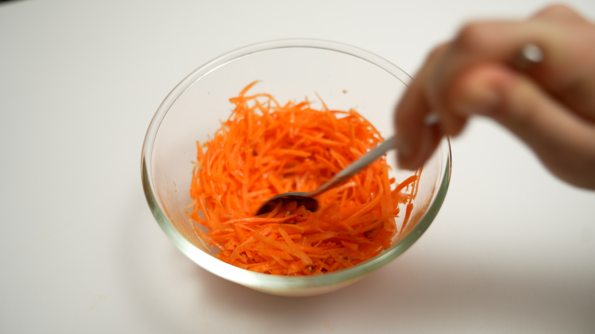 채 썬 당근을 볼에 넣고, 홀그레인 머스타드 0.5T
