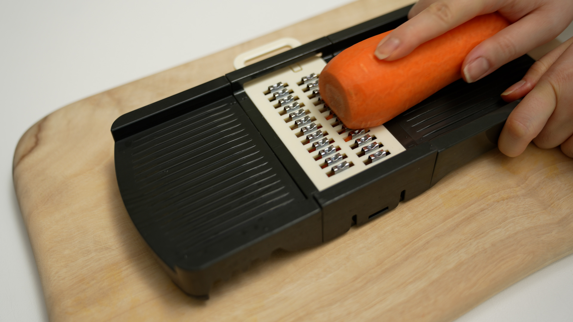 채칼을 이용해서 당근 한 개를 채 썰어주세요.
